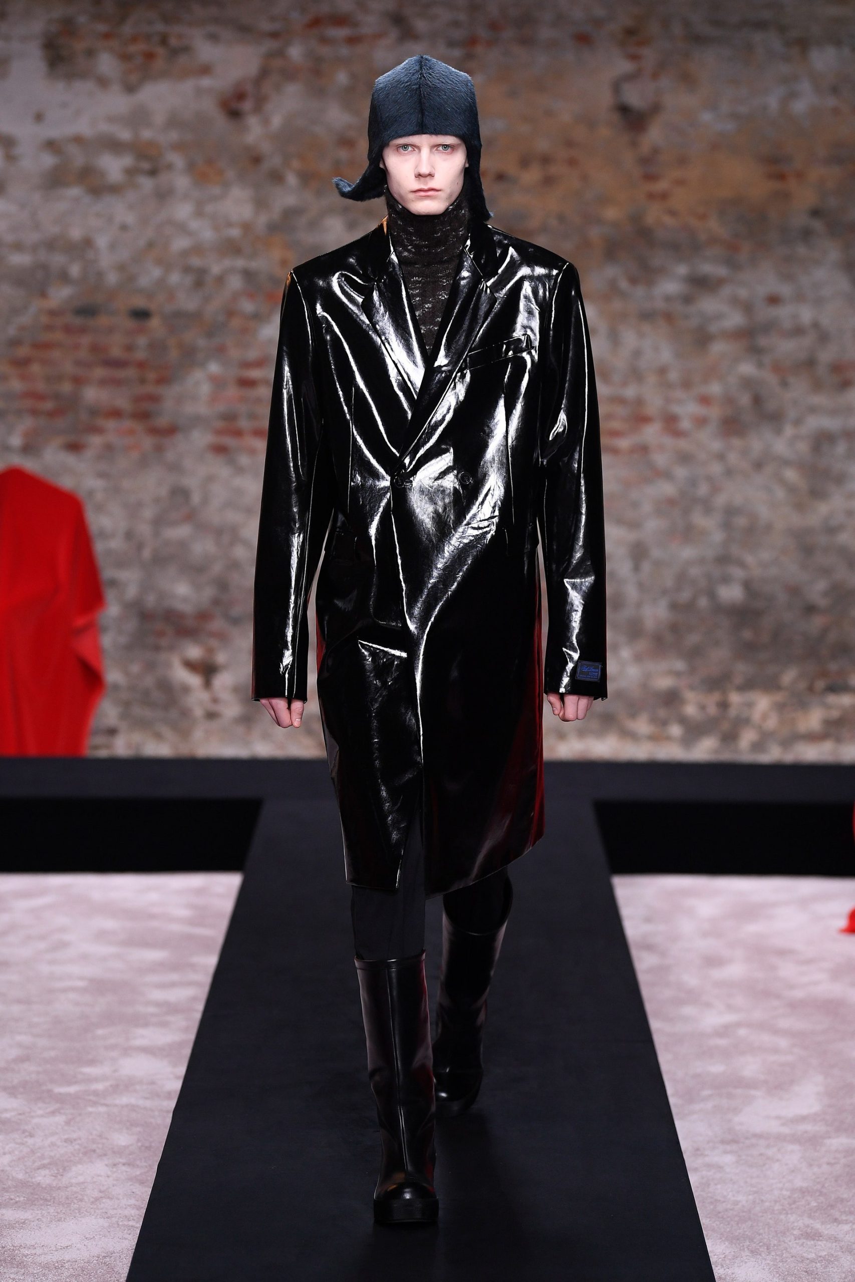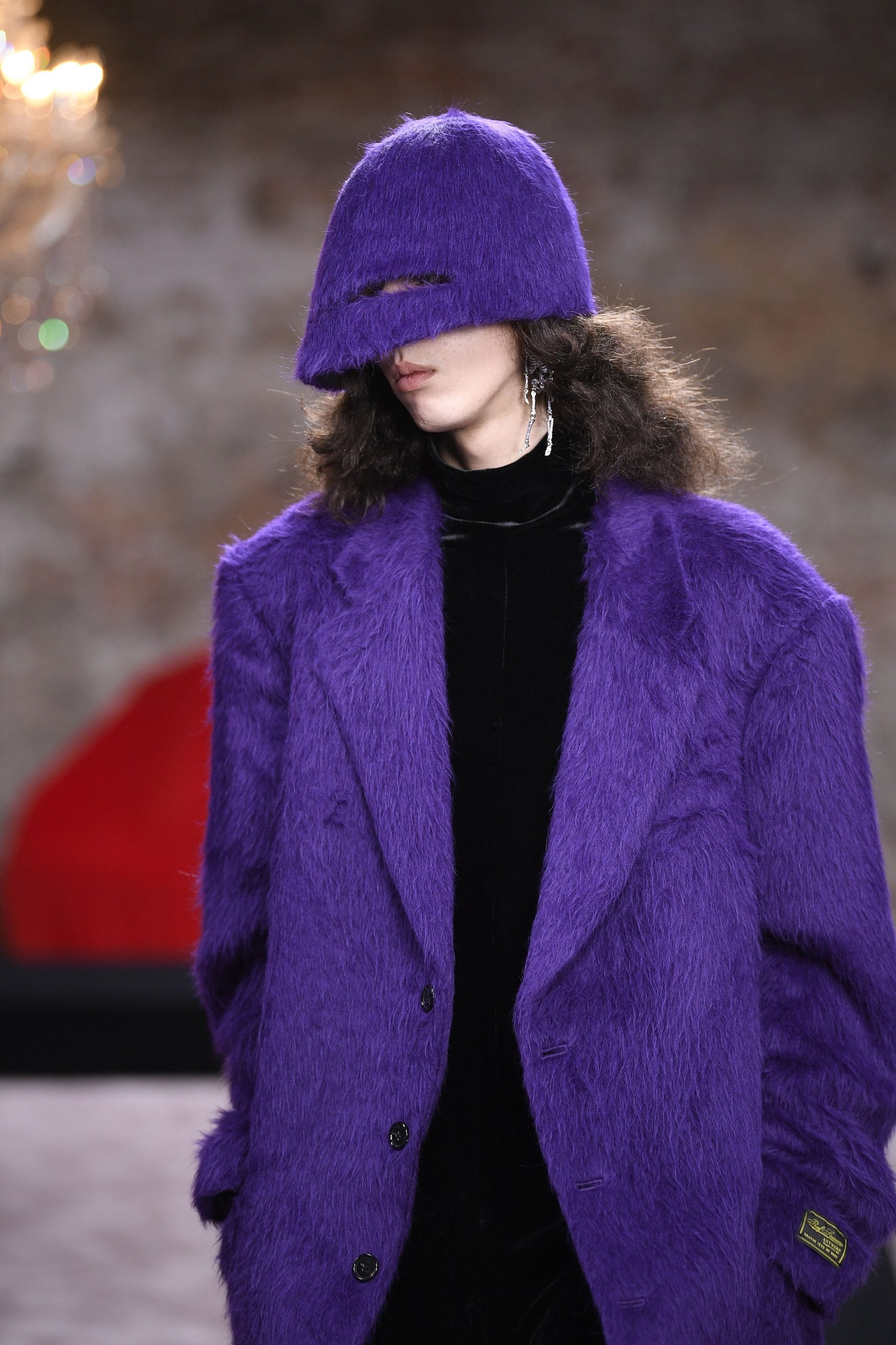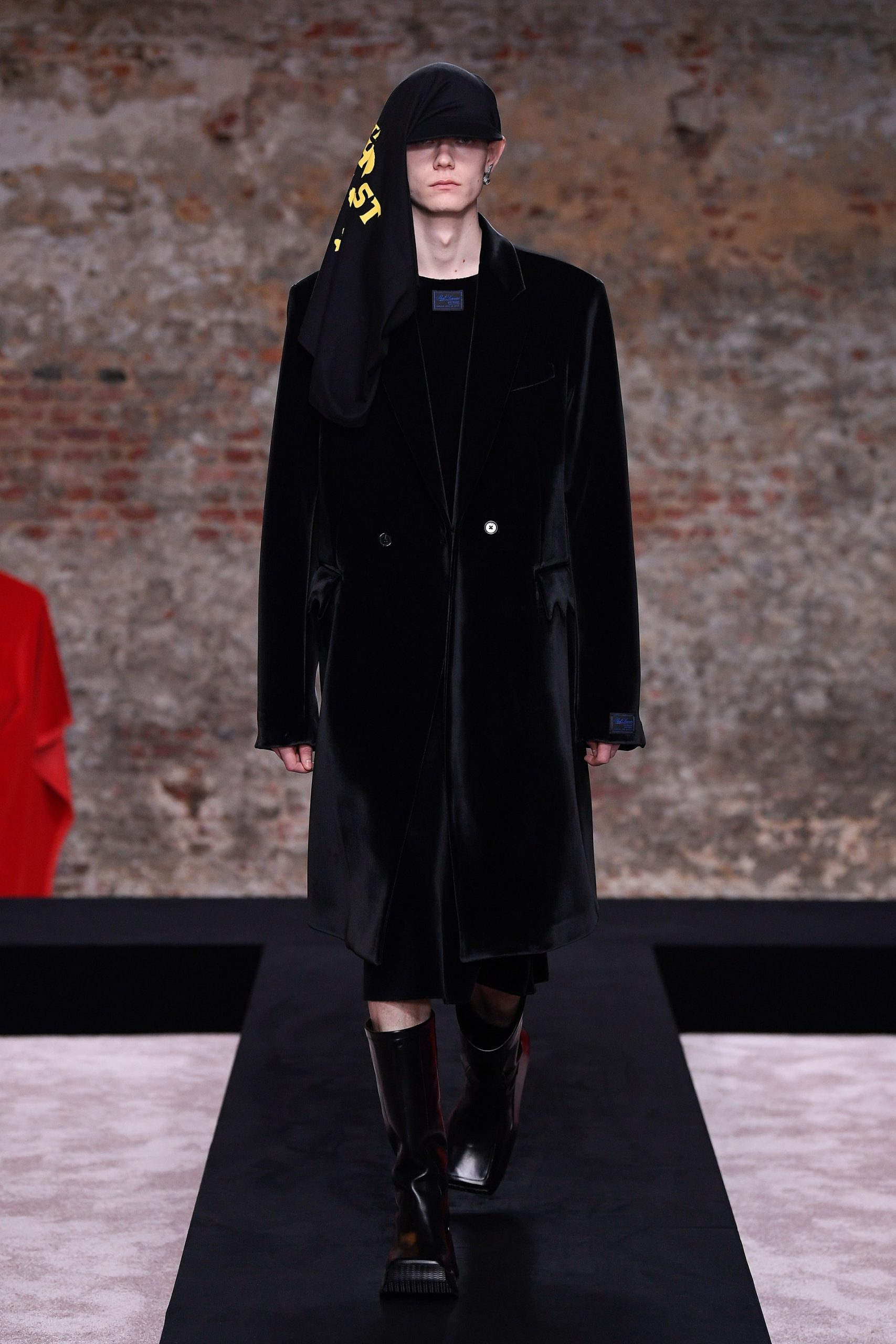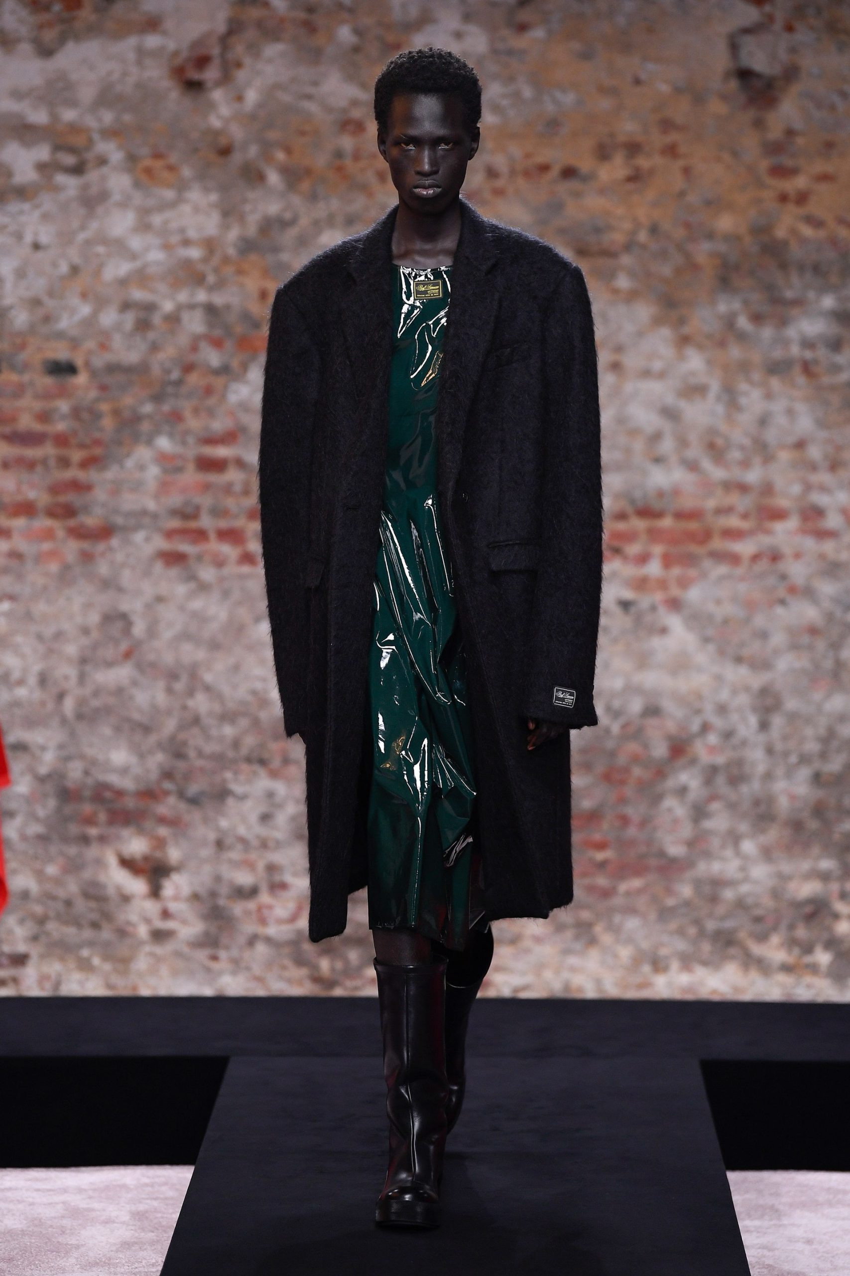Xuyên suốt 54 look diễn Raf Simons là những phom dáng góc cạnh, bóng bẩy, và có chút kỳ quái. Ở đó, những kiểu dáng thời trang để lại ấn tượng mạnh mẽ nhất có lẽ là chiếc nón gắn liền với lớp áo choàng từ chất liệu mohair, tia sáng óng ánh từ những bộ áo choàng tu sĩ và bodysuit, và những đôi bốt đen tuyền cách điệu. Dàn người mẫu nối chân nhau bước đi trong một bối cảnh rùng rợn với lớp tường sờn ảm đạm trên đầu là chiếc đèn chùm thủy tinh, xung quanh là những nội thất bị phủ kín bởi lớp vải đỏ.
