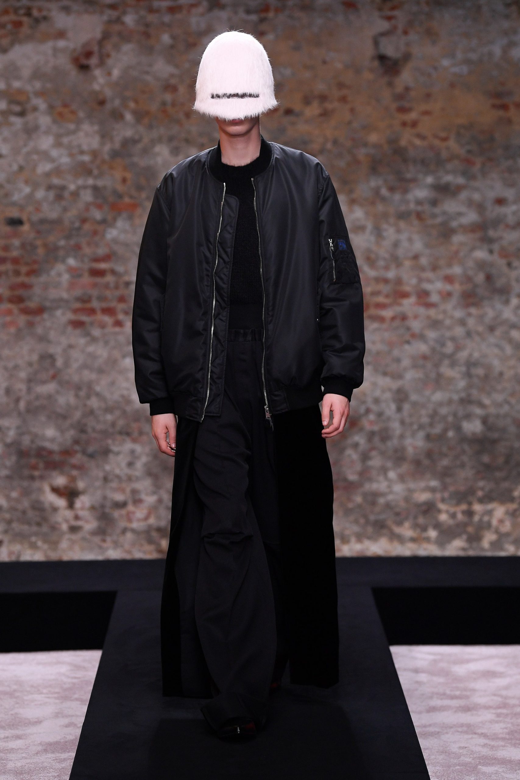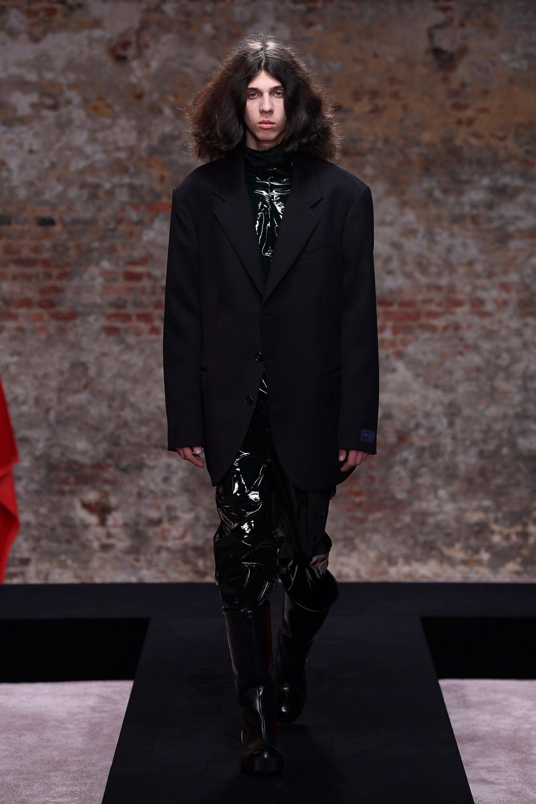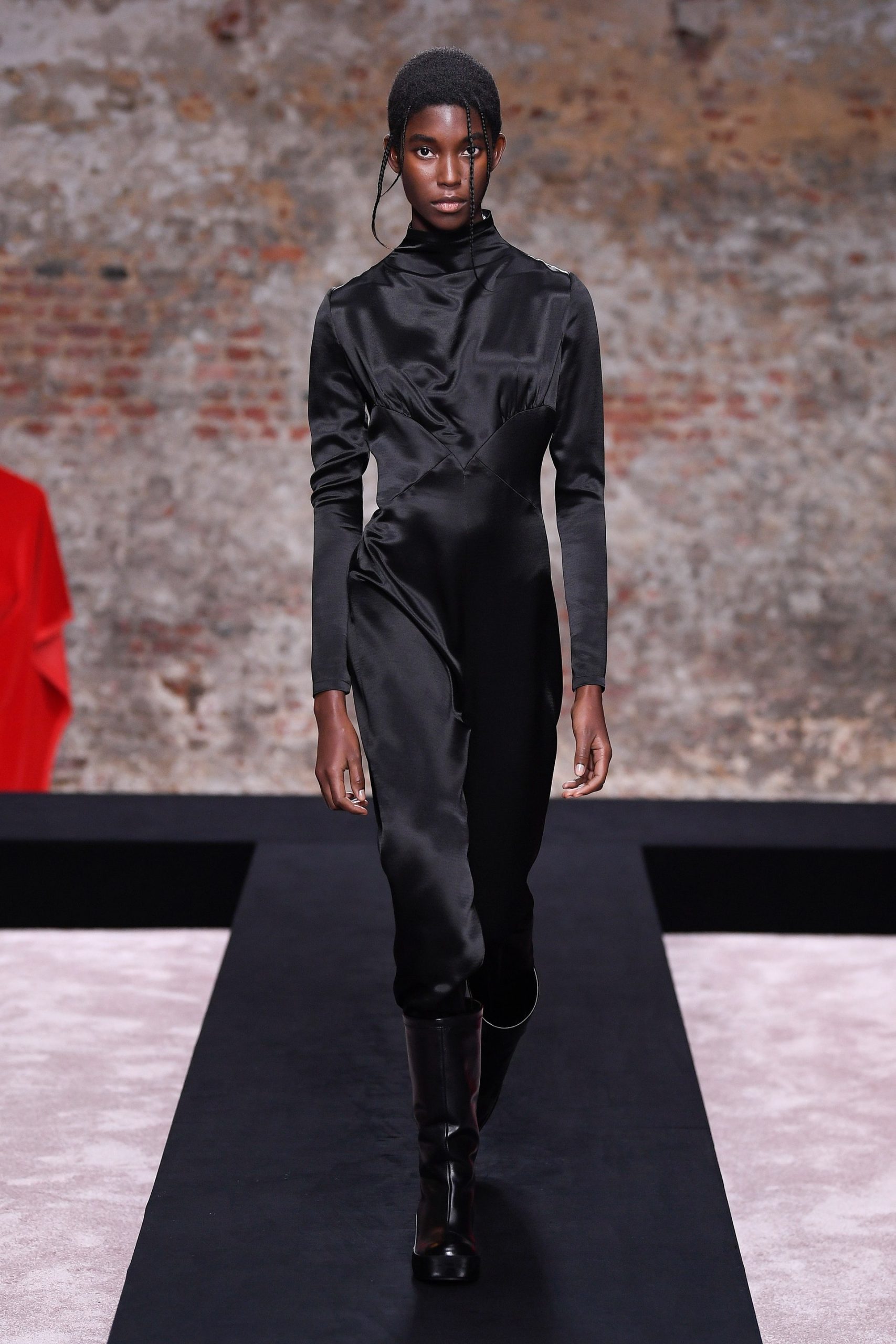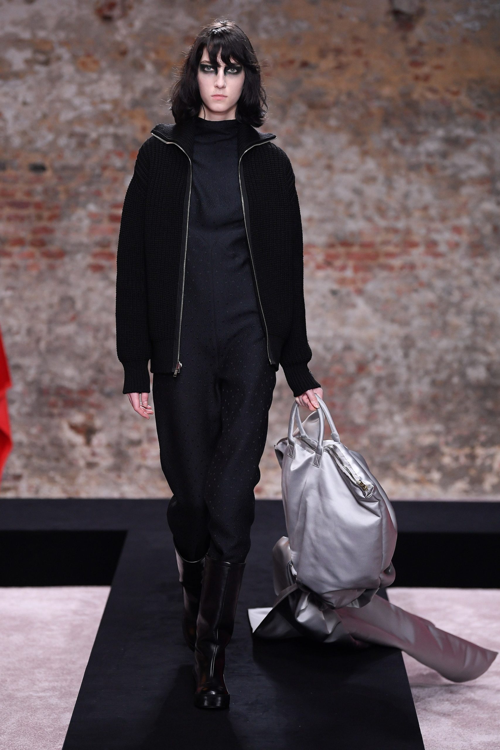 Xuyên suốt 54 look diễn Raf Simons là những phom dáng góc cạnh, bóng bẩy, và có chút kỳ quái. Ở đó, những kiểu dáng thời trang để lại ấn tượng mạnh mẽ nhất có lẽ là chiếc nón gắn liền với lớp áo choàng từ chất liệu mohair, tia sáng óng ánh từ những bộ áo choàng tu sĩ và bodysuit, và những đôi bốt đen tuyền cách điệu. Dàn người mẫu nối chân nhau bước đi trong một bối cảnh rùng rợn với lớp tường sờn ảm đạm trên đầu là chiếc đèn chùm thủy tinh, xung quanh là những nội thất bị phủ kín bởi lớp vải đỏ.