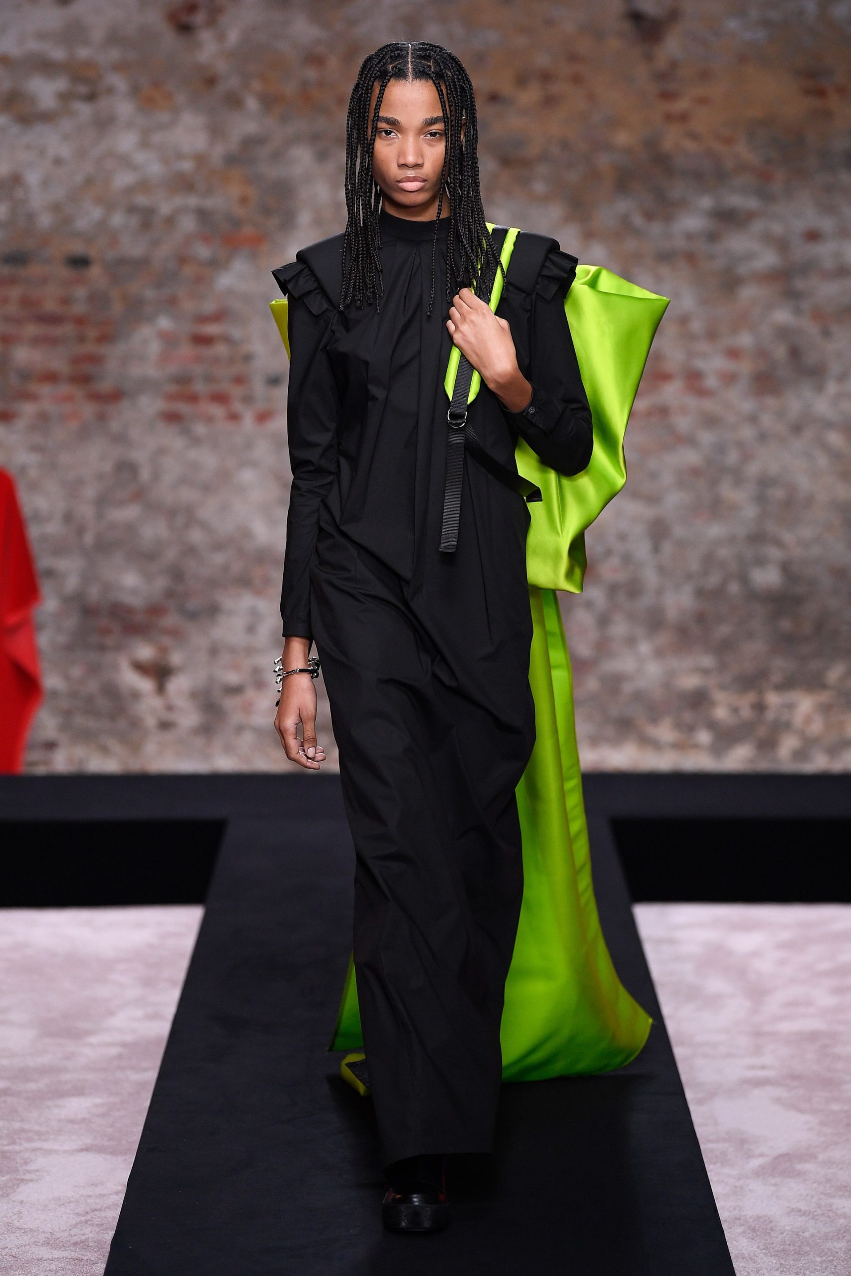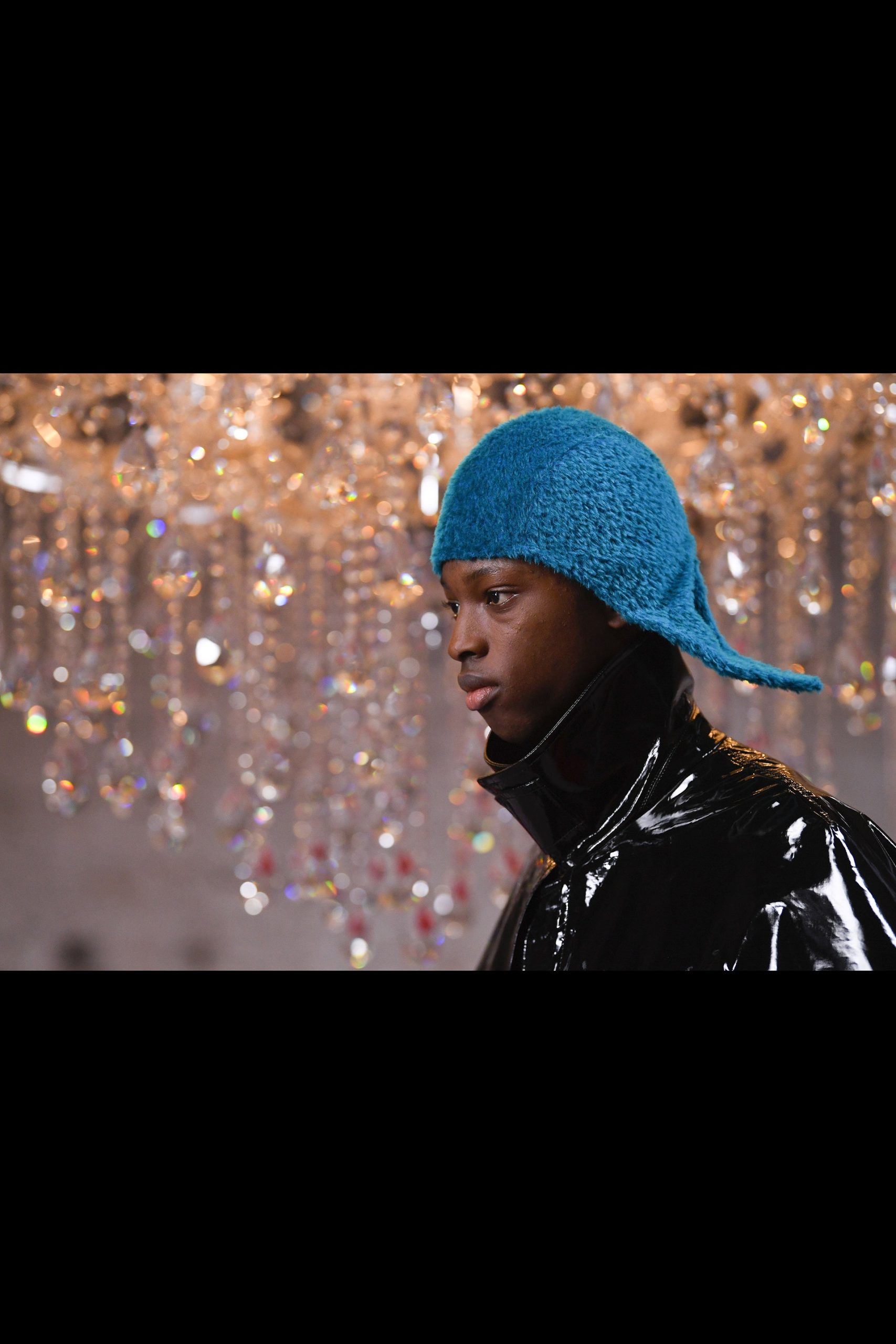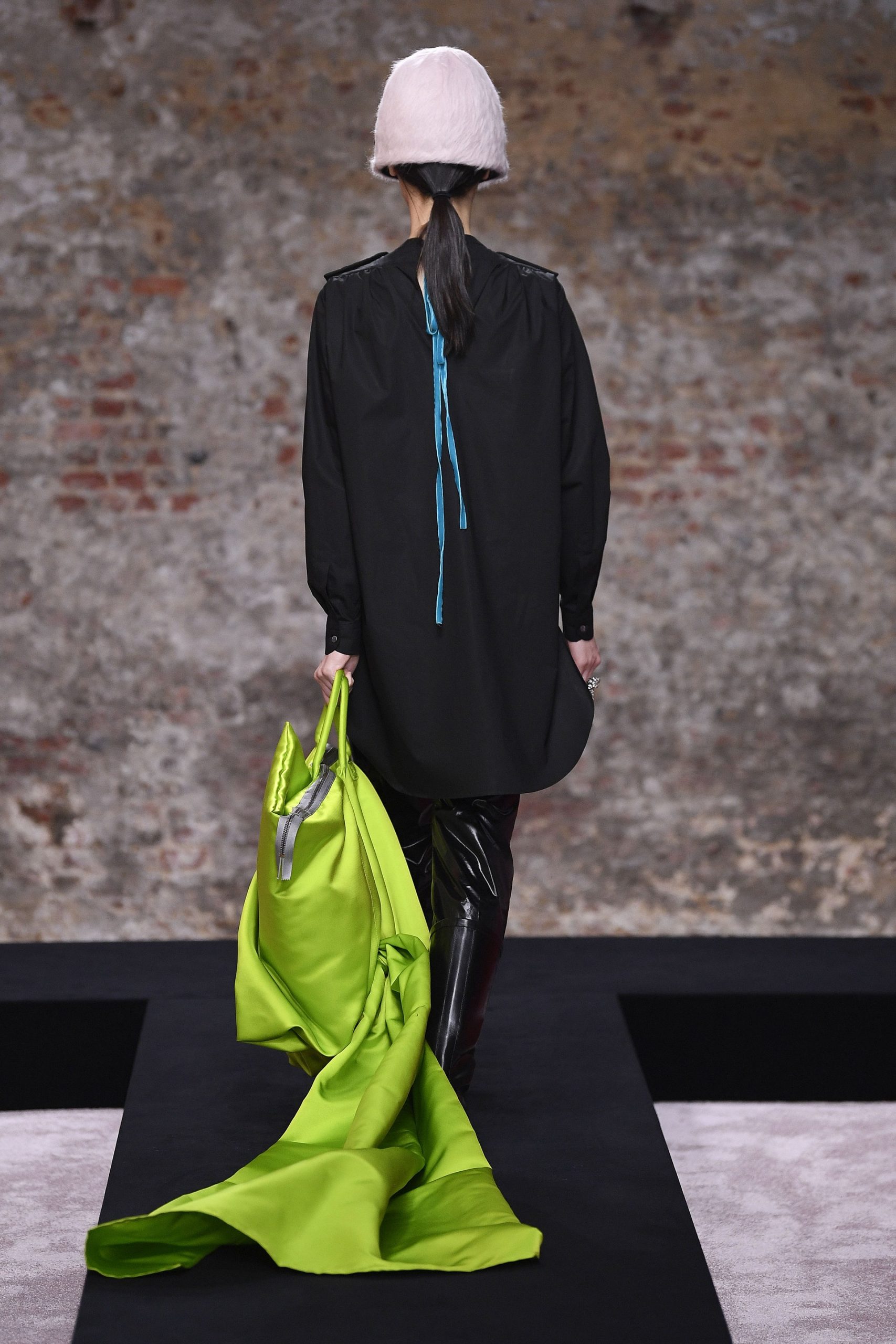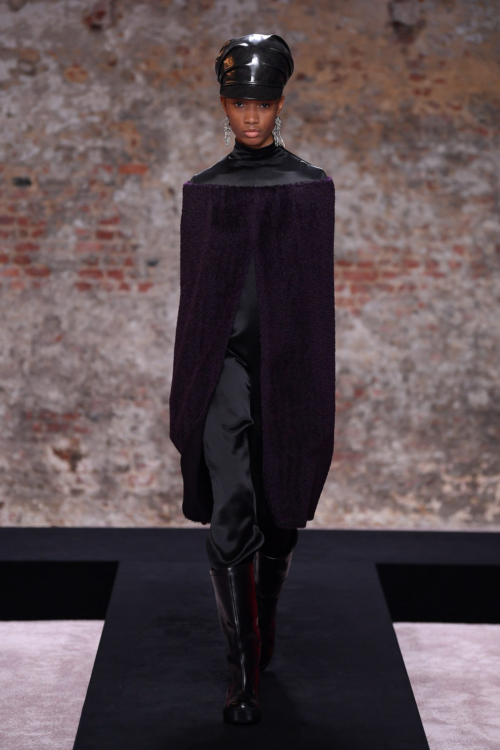 Xuyên suốt 54 look diễn Raf Simons là những phom dáng góc cạnh, bóng bẩy, và có chút kỳ quái. Ở đó, những kiểu dáng thời trang để lại ấn tượng mạnh mẽ nhất có lẽ là chiếc nón gắn liền với lớp áo choàng từ chất liệu mohair, tia sáng óng ánh từ những bộ áo choàng tu sĩ và bodysuit, và những đôi bốt đen tuyền cách điệu. Dàn người mẫu nối chân nhau bước đi trong một bối cảnh rùng rợn với lớp tường sờn ảm đạm trên đầu là chiếc đèn chùm thủy tinh, xung quanh là những nội thất bị phủ kín bởi lớp vải đỏ.