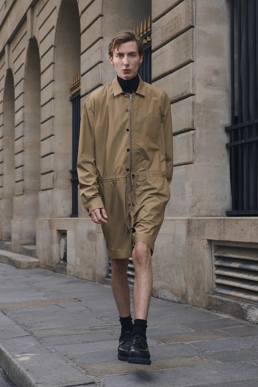 Tinh thần khám phá, thám hiểm được thể hiện rõ rệt hơn ở thời trang nam, qua các thiết kế áo vest, áo khoác đậm tính công năng. Thiết kế nón tai bèo và giày chukka boots càng nhấn mạnh hơn tính chất di chuyển của từng trang phục. Xen kẽ giữa những outfit “cắm trại” ấy, ta vẫn thấy được nét thư thả sang trọng qua chiếc blazer ngoại cỡ, bộ áo jumpsuit và đôi dép đế dày.