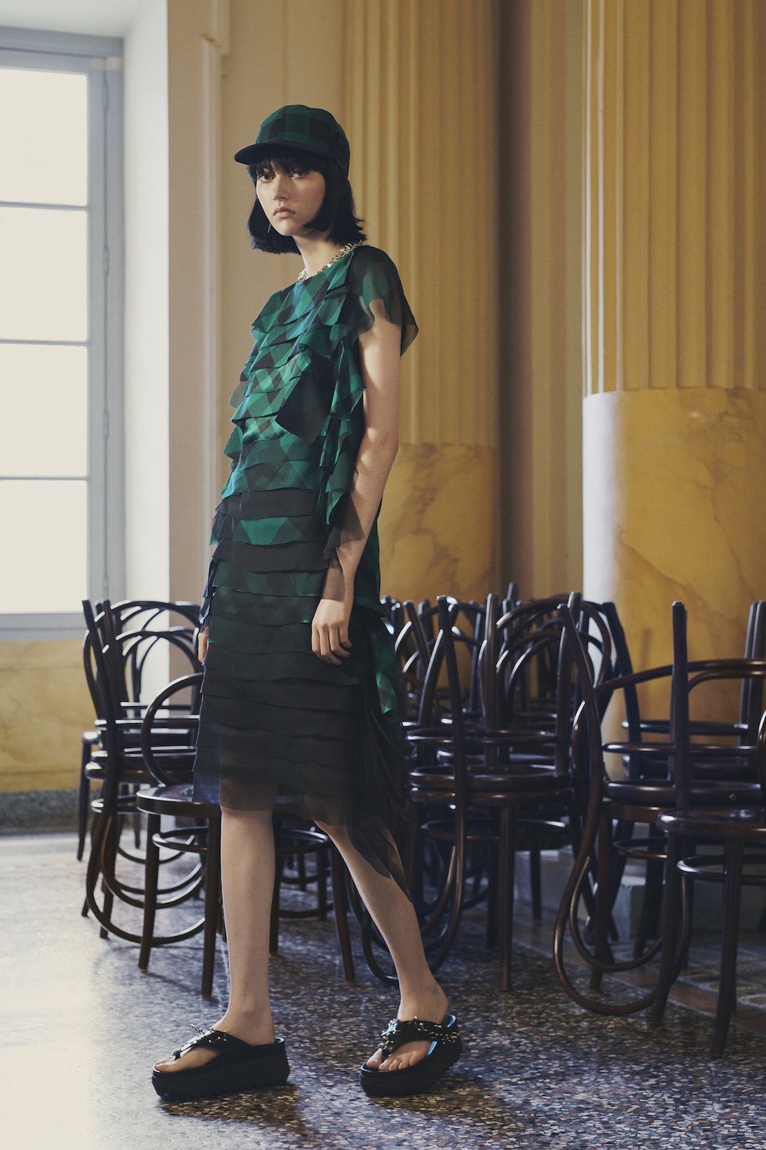 Đặc biệt, sự kết hợp lần này còn đánh dấu lần đầu tiên ACRONYM ra mắt phom dáng váy, ở bộ sưu tập dành cho nữ. Có thể dễ dàng nhận thấy kiểu cách trang phục ứng dụng trang nhã qua bộ sưu tập sacai mùa Xuân 2022. Có lẽ, đây là câu trả lời quen thuộc nhằm bù đắp cho khoảng thời gian đại dịch, hướng đến một lối sống khát khao tự do hơn. Chitose Abe đã dùng satin làm chất liệu cho áo khoác đi mưa. Không những vậy, bà còn kết hợp một cách độc đáo giữa áo len sọc buffalo và chiếc váy maxi vải xoan, hay làm nên chiếc áo khoác chesterfield từ voan trắng đính họa tiết bandana.