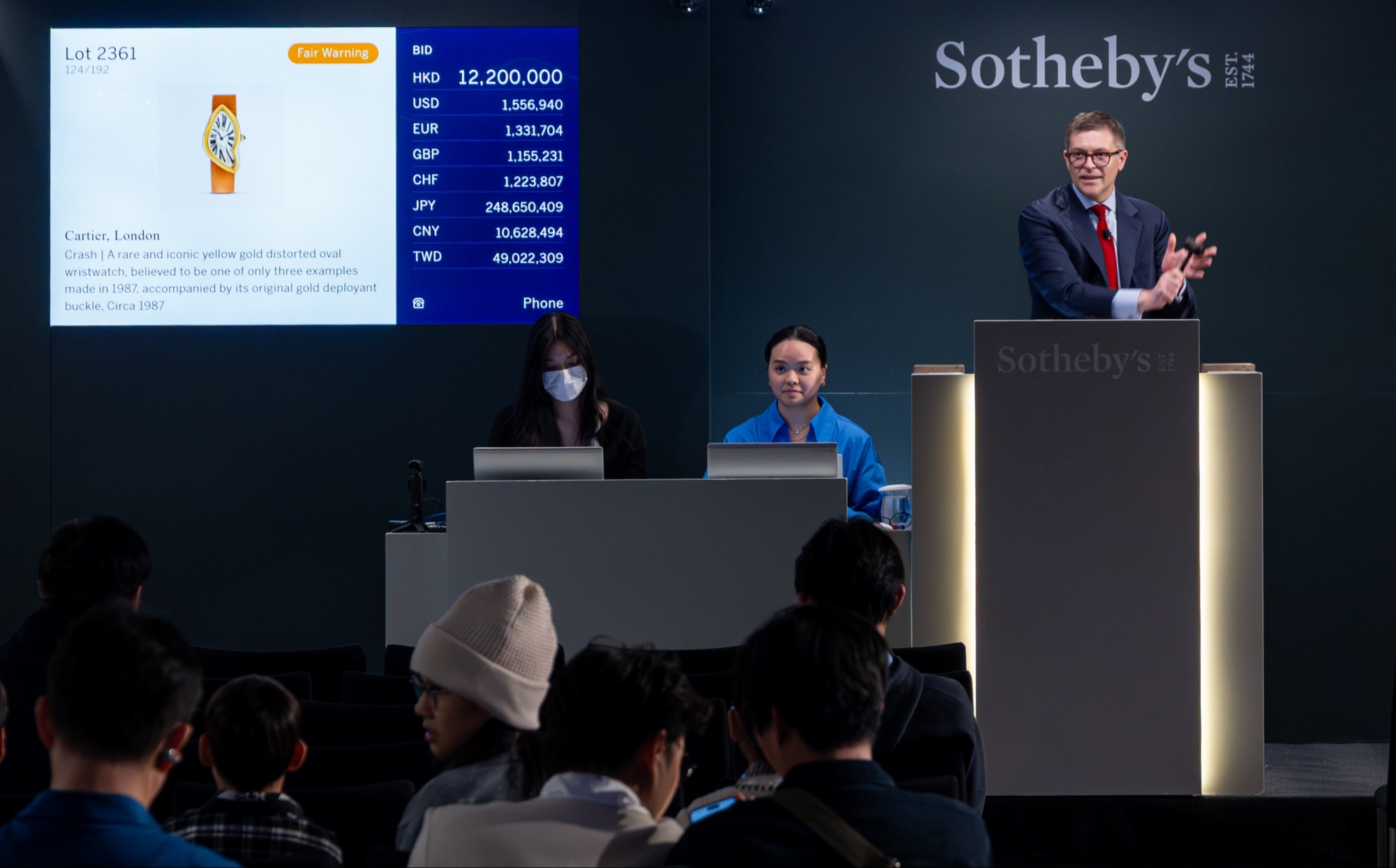 Dẫn đầu toàn bộ sự kiện là chiếc Cartier London Crash bằng vàng vàng, sản xuất khoảng năm 1987. Sau 9 phút cạnh tranh quyết liệt giữa các nhà sưu tầm trực tuyến, qua điện thoại và tại phòng đấu giá, mẫu đồng hồ đạt mức HK$15,616,000 (US$1,99 triệu), hơn gấp đôi mức kỳ vọng ban đầu. Kết quả này đưa nó trở thành chiếc Cartier đeo tay giá trị nhất từng được bán đấu giá. Theo giới nghiên cứu, số lượng London Crash nguyên bản giai đoạn 1967–1970 được cho là chưa đến 12 chiếc, còn phiên bản năm 1987 nhiều khả năng chỉ tồn tại 3 chiếc.