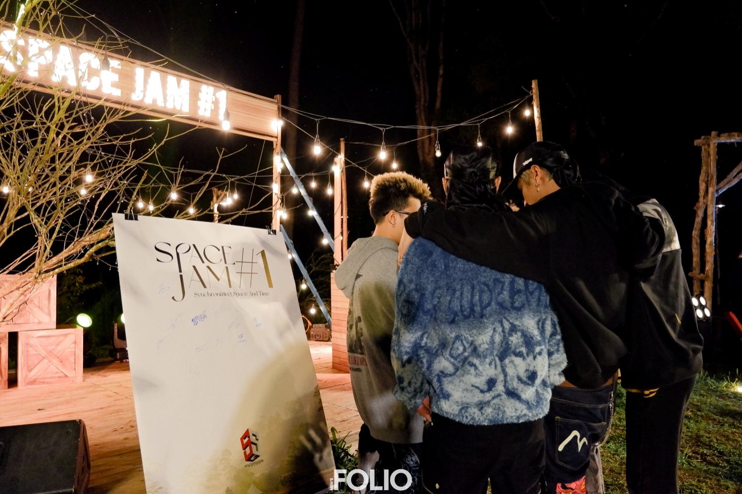 Kết thúc buổi jam cũng là thời khắc chạng vạng, mọi người cùng nhau tiến về khu vực sân khấu rực sáng ánh đèn. Ở đây, tất cả nghệ sĩ và khách mời lần lượt kí tên mình lên tấm bảng lớn, như một kỷ niệm chung cho đêm trại đầu tiên cùng nhau. Ký xong, mọi người ổn định chỗ ngồi nơi bàn tiệc, cùng nhau thưởng thức những món thịt và rau nướng đậm chất du mục, cùng các loại thức uống đa dạng.