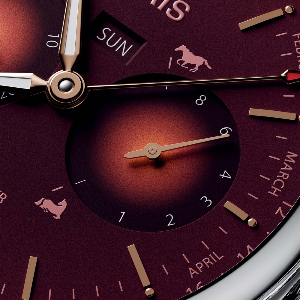 Mặt số mang sắc đỏ crimson, kết hợp cùng các chi tiết mạ vàng, tượng trưng cho may mắn và thịnh vượng. Lịch tuần 52 tuần được bố trí vòng ngoài mặt số, hiển thị bằng kim trung tâm mạ vàng với đầu kim sơn hồng. Phía trong, lịch tháng được ghi đầy đủ bằng chữ, đặt gọn gàng giữa các cọc số nổi và hai chữ số Ả Rập 12 và 6 giờ.