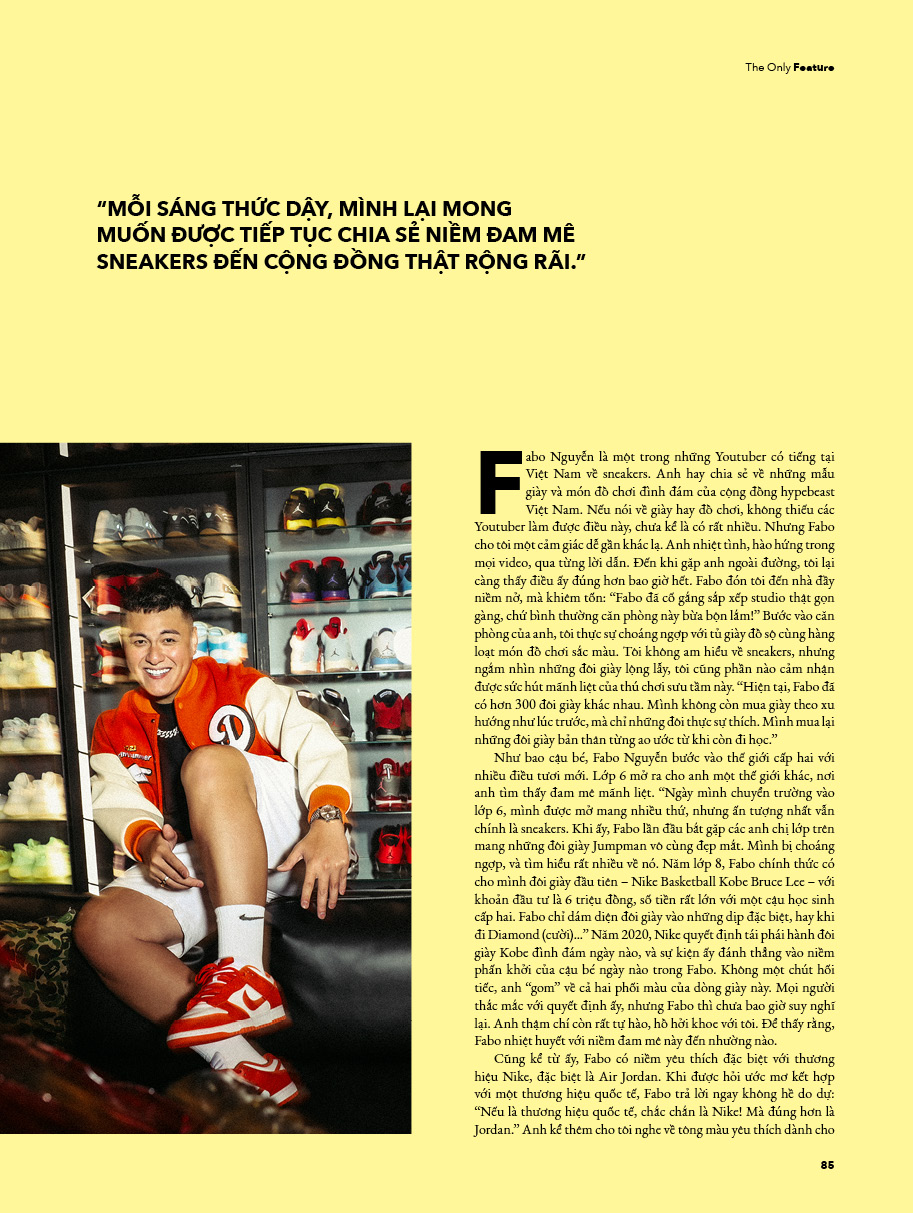 Với sự phát triển của thời trang trong 10 năm đổ lại, văn hóa sneaker gắn liền với streetwear cũng dần khẳng định vị trí vững vàng với giới trẻ. Một trong những đại diện tiên phong, không ai khác, chính là Fabo Nguyễn. Đam mê sưu tầm giày từ khi còn học lớp 6, Fabo Nguyễn là một trong những nhà sưu tầm giày thể thao đáng ngưỡng mộ của cộng đồng HYPEBEAST Việt Nam. Anh sở hữu kênh youtube riêng chia sẻ về những bản phát hành giày và món đồ chơi đình đám của giới trẻ, với gần 800,000 người theo dõi. Không chỉ nổi tiếng bởi độ “chơi”, Fabo Nguyễn còn sở hữu màu sắc độc lập với sự nhiệt huyết và khiêm tốn. Anh đem đến một hình ảnh đáng tự hào cho cộng đồng sneaker, và khơi nguồn cảm hứng cho nhiều bạn trẻ theo đuổi đam mê.