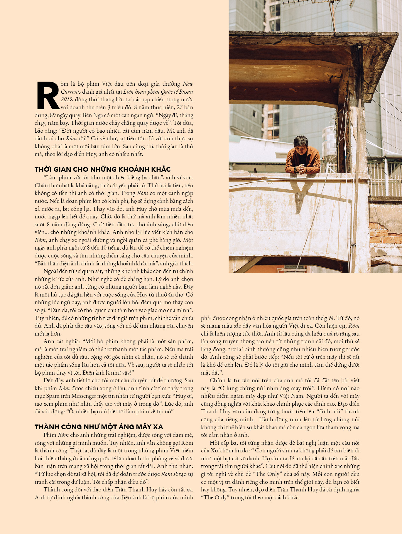 Nhiều người có lẽ sẽ hơi xa lạ với cái tên Trần Thanh Huy, nhưng họ đều biết đến Ròm, tác phẩm điện ảnh đầu tay được anh thực hiện trong 8 năm. Đây là bộ phim Việt đầu tiên đoạt giải thưởng New Currents danh giá nhất tại Liên hoan phim Quốc tế Busan 2019, đồng thời thắng lớn tại các rạp chiếu trong nước với doanh thu trên 3 triệu đô.