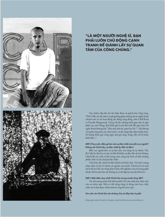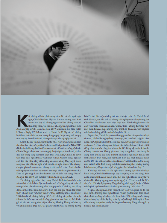 Khi xã hội đổ dồn mối quan tâm vào hình thức giải trí phổ thông, đâu đó vẫn là những người nghệ sĩ thầm lặng tranh đấu vì bộ môn nghệ thuật của mình, như Chinh Ba. Thực hành đa dạng các loại hình nghệ thuật từ thơ, âm nhạc, âm thanh cho đến trình diễn nghệ thuật, Chinh Ba là một trong những nghệ sỹ đương đại nhận được nhiều quan tâm từ giới quan tâm nghệ thuật trong năm 2020-2021.