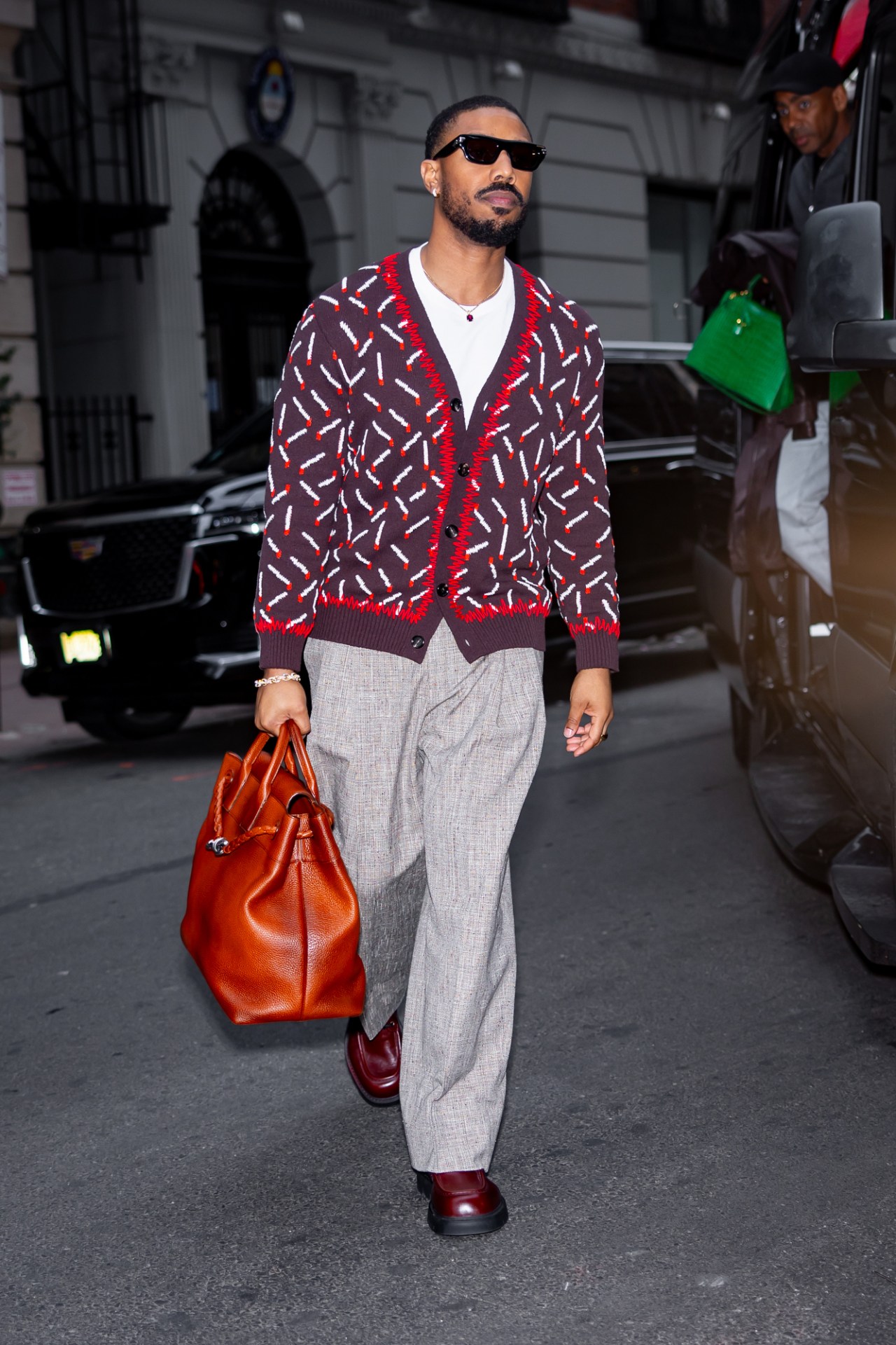 Knitwear trở thành điểm nhấn chính của mùa mốt 2026. Cardigan dáng lửng phối cùng T-shirt, như cách Michael B. Jordan hay Jacob Elordi lựa chọn, mang lại cảm giác hiện đại cho những phom dáng quen thuộc. Áo len không còn là lớp trang phục mặc thêm, mà trở thành điểm nhấn của tổng thể, đi cùng quần xếp ly, chinos cạp cao hoặc denim phom relaxed.