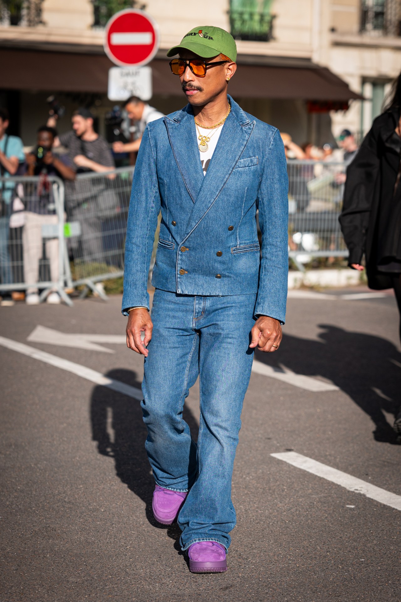 Pharrell Williams là một trong những người góp phần rõ rệt vào sự thay đổi này. Anh thường xuyên xuất hiện với những set đồ denim-on-denim, phối nhiều sắc độ khác nhau, kết hợp phụ kiện và phom dáng trang phục có tính nhất quán. Với Pharrell, denim không còn là lựa chọn an toàn, mà là một tuyên bố thời trang.