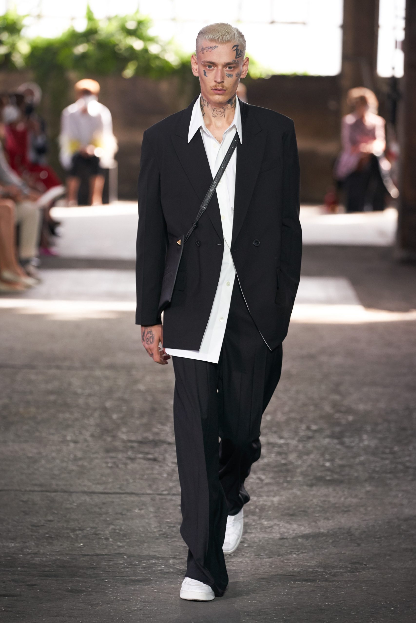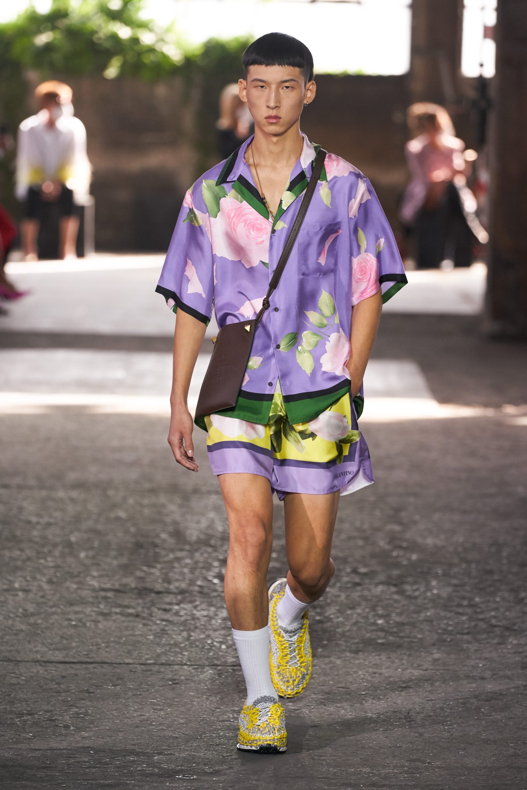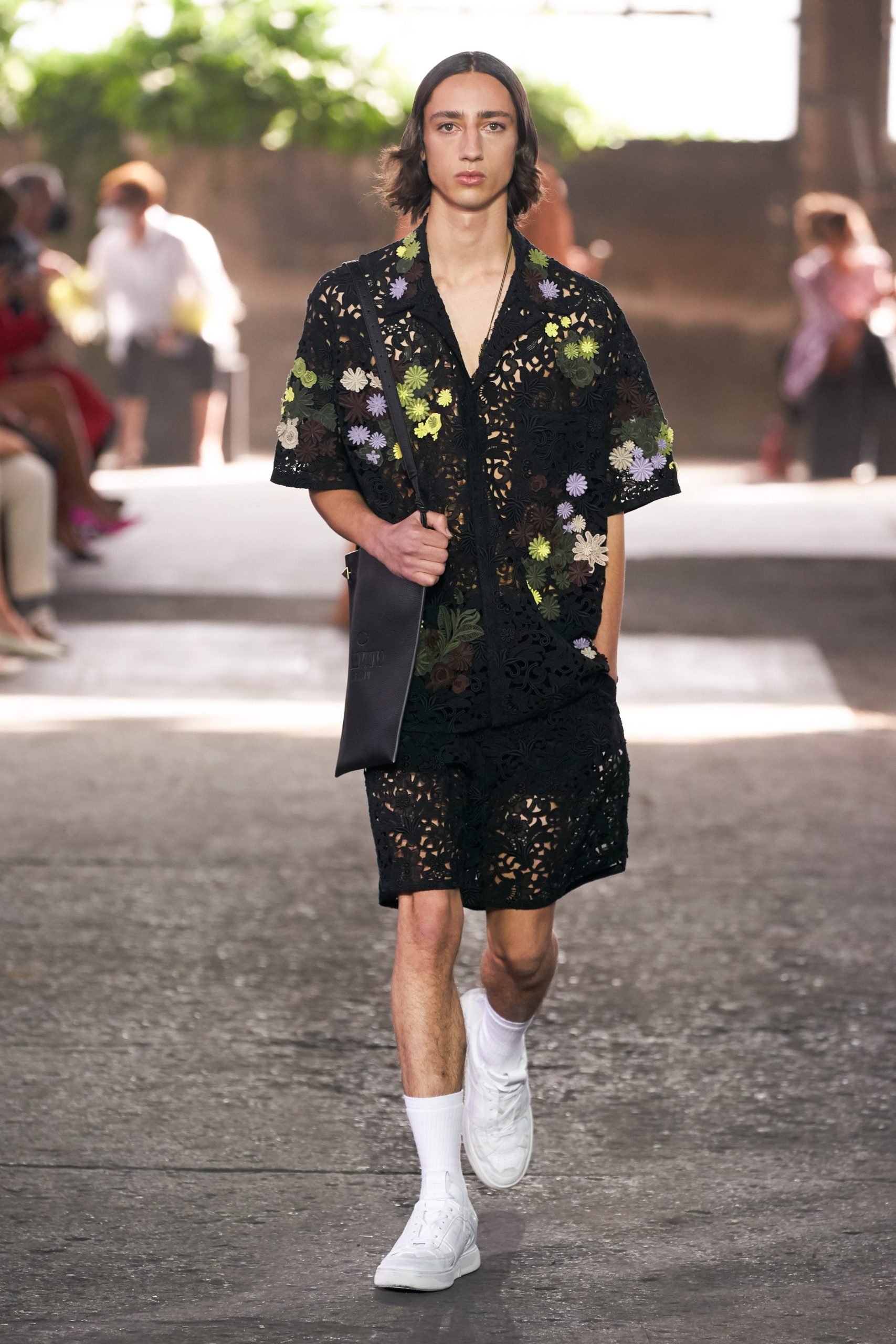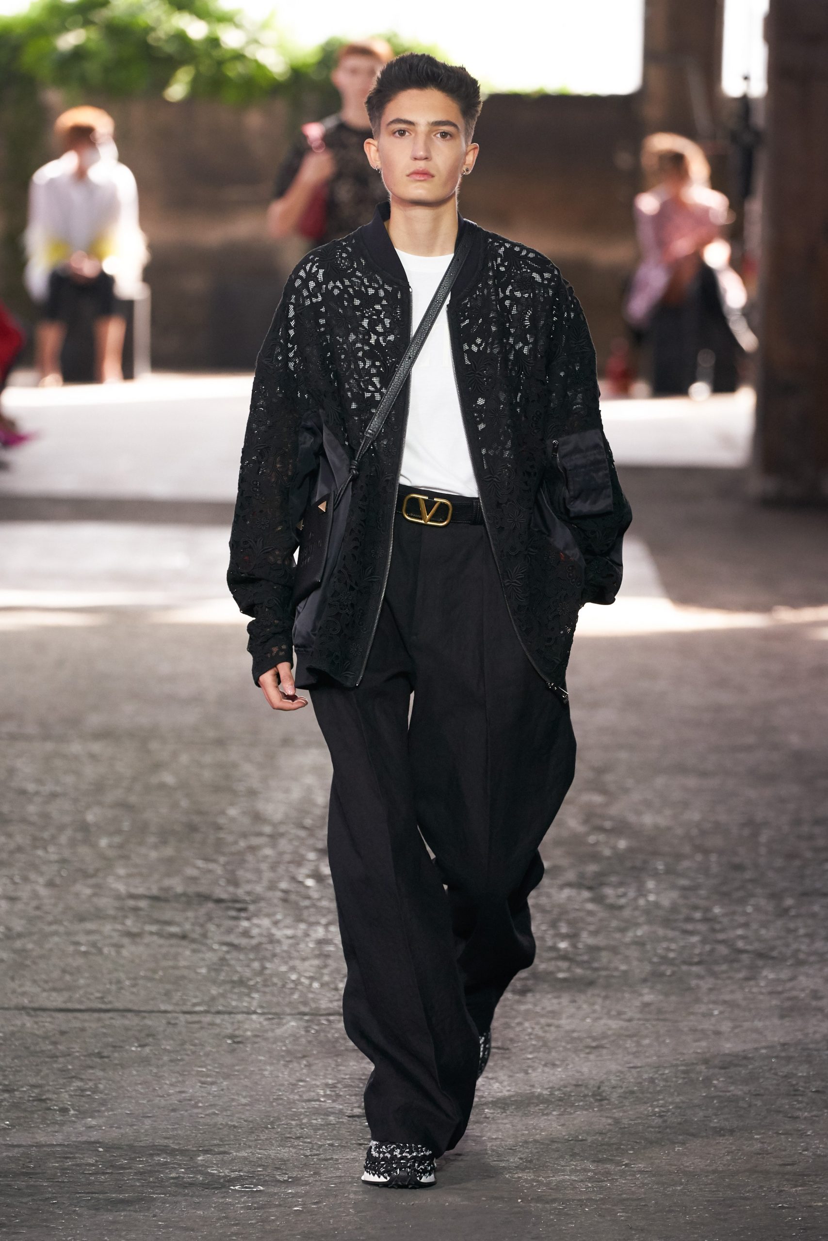 Bộ sưu tập (BST) Xuân Hè 2021 Valentino là sự chơi đùa với những điều lệ truyền thống. Những họa tiết hoa hòe, chất liệu vải ren được Piccioli áp dụng trên những chiếc áo sơ mi, áo khoác nam. Suit jacket trang trọng thì lại được ông phối với quần lửng may riêng.