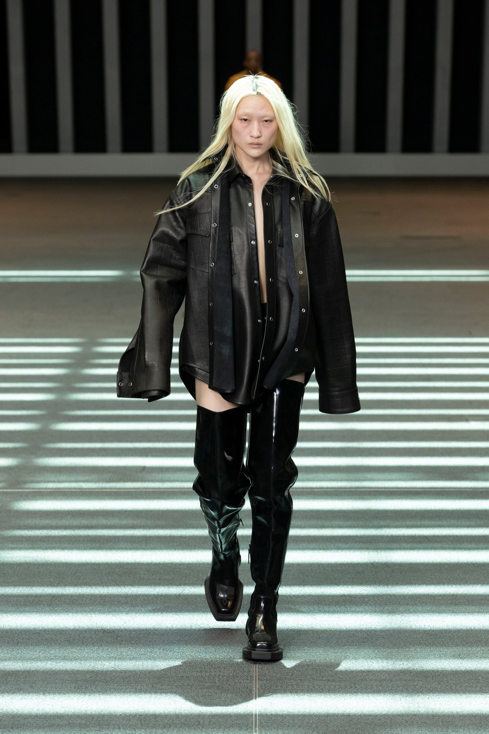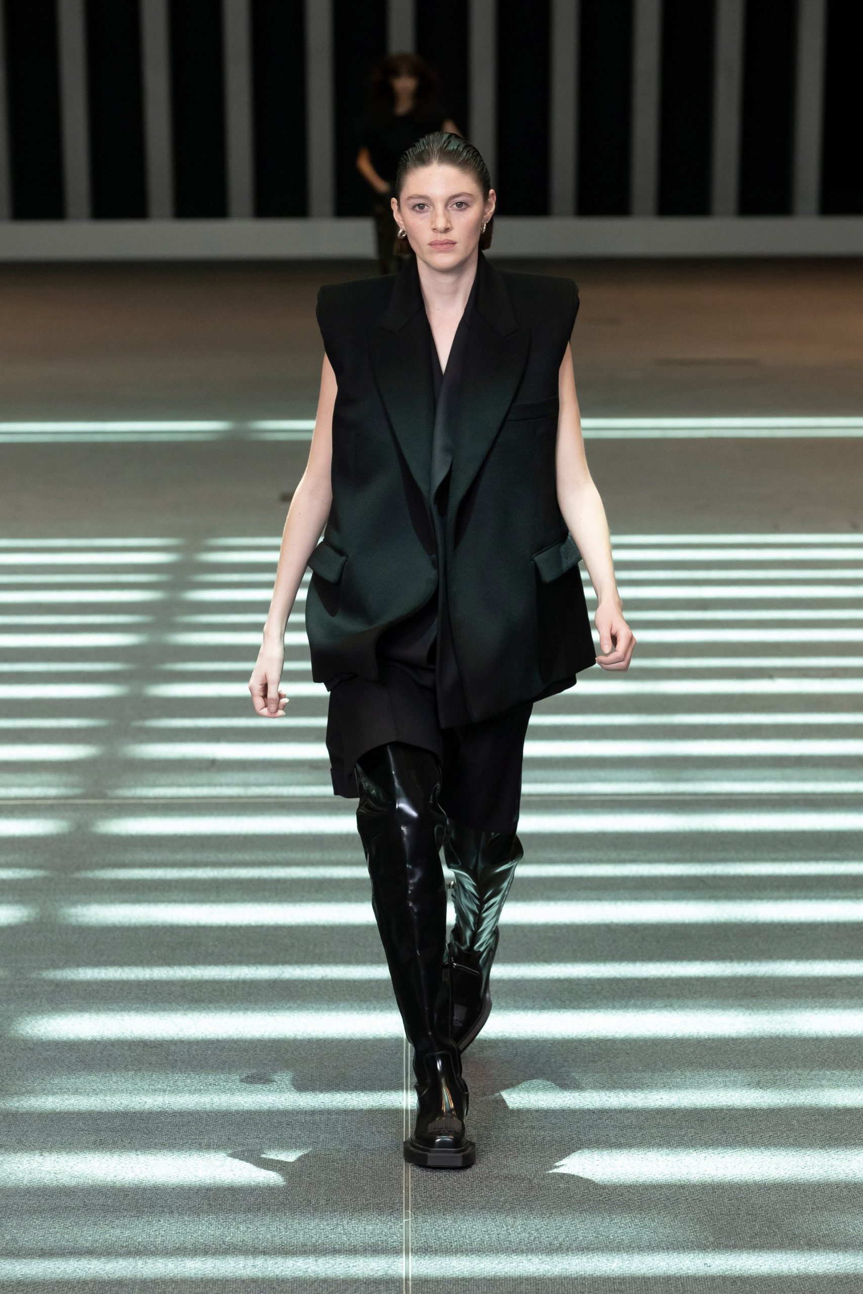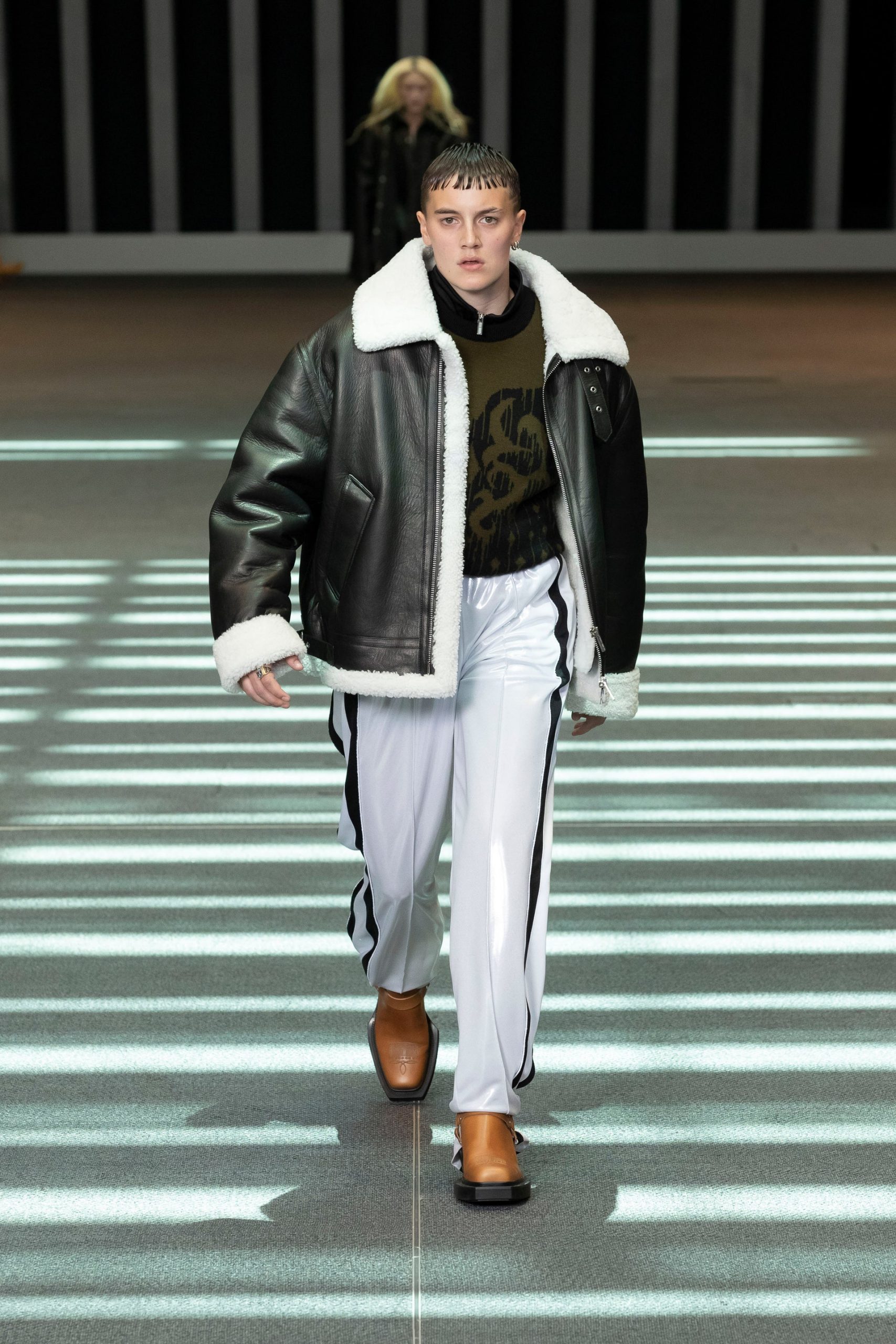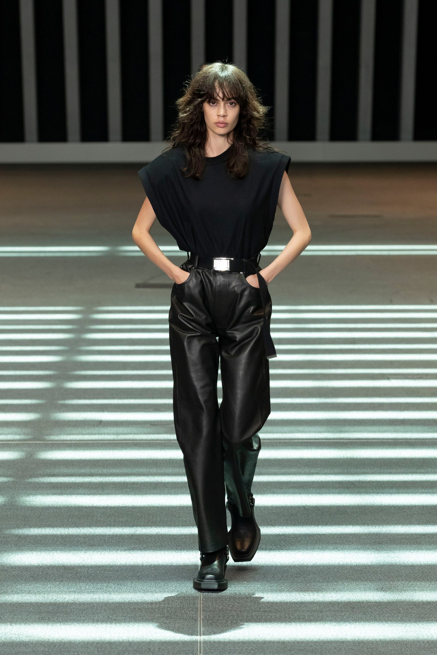 Ngay từ những bộ cánh đầu tiên, câu chuyện bình đẳng giới đã được lột tả thẳng thắn qua các thiết kế áo phom crop top, từ áo thun cho đến các loại áo khoác. Cùng với đó, chúng ta tiếp tục chứng kiến những phom dáng đang làm nên xu hướng giới trẻ hiện tại: thiết kế vai độn đồ sộ, tạo hình hai lớp trên quần da hay các dòng áo khoác, từ các mẫu áo dài kín kẽ đến phom dáng sát nách gai góc. Sự phóng đại trên những món đồ luôn là những phẩm chất đặc trưng trên đồ của VTMNTS.