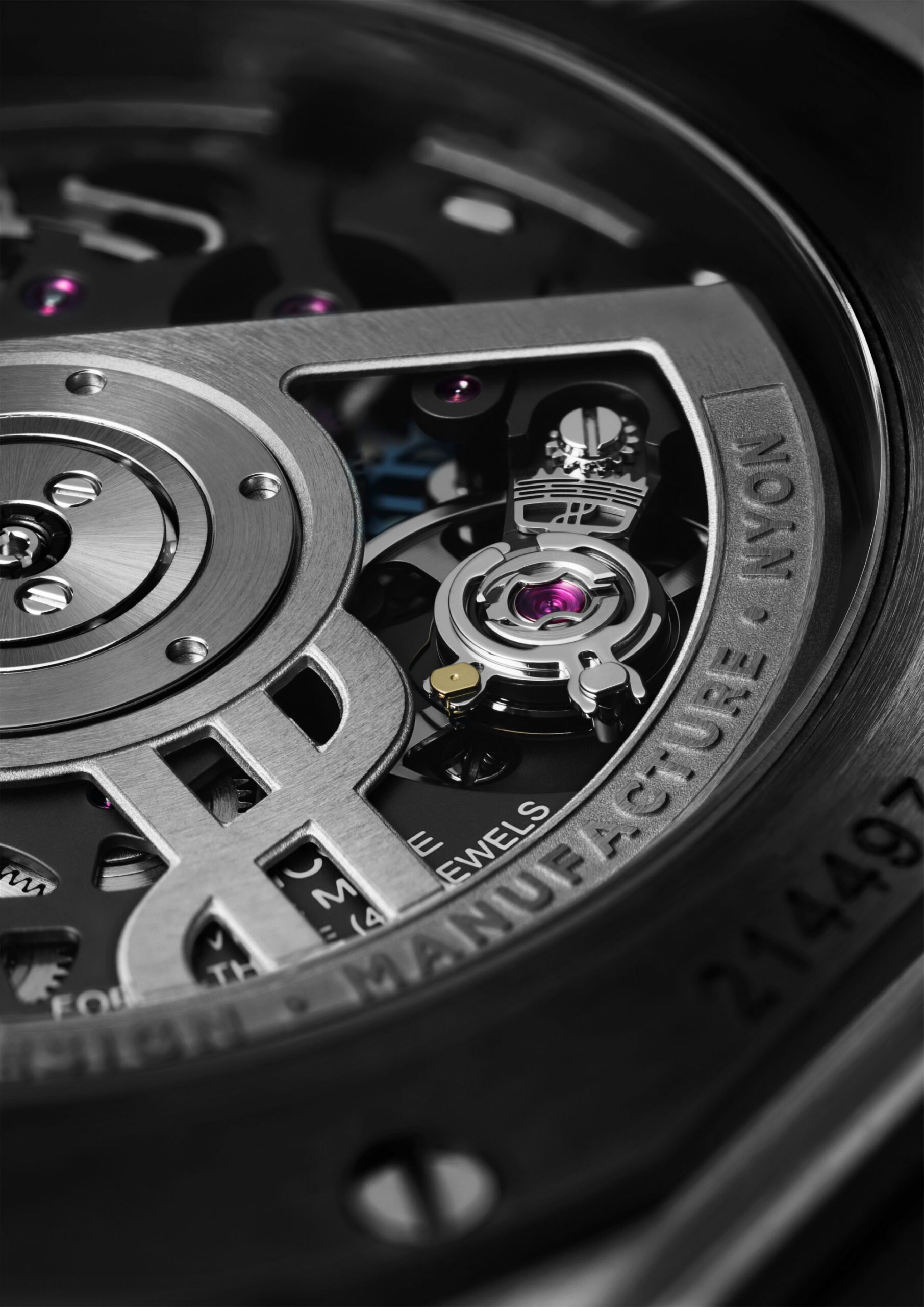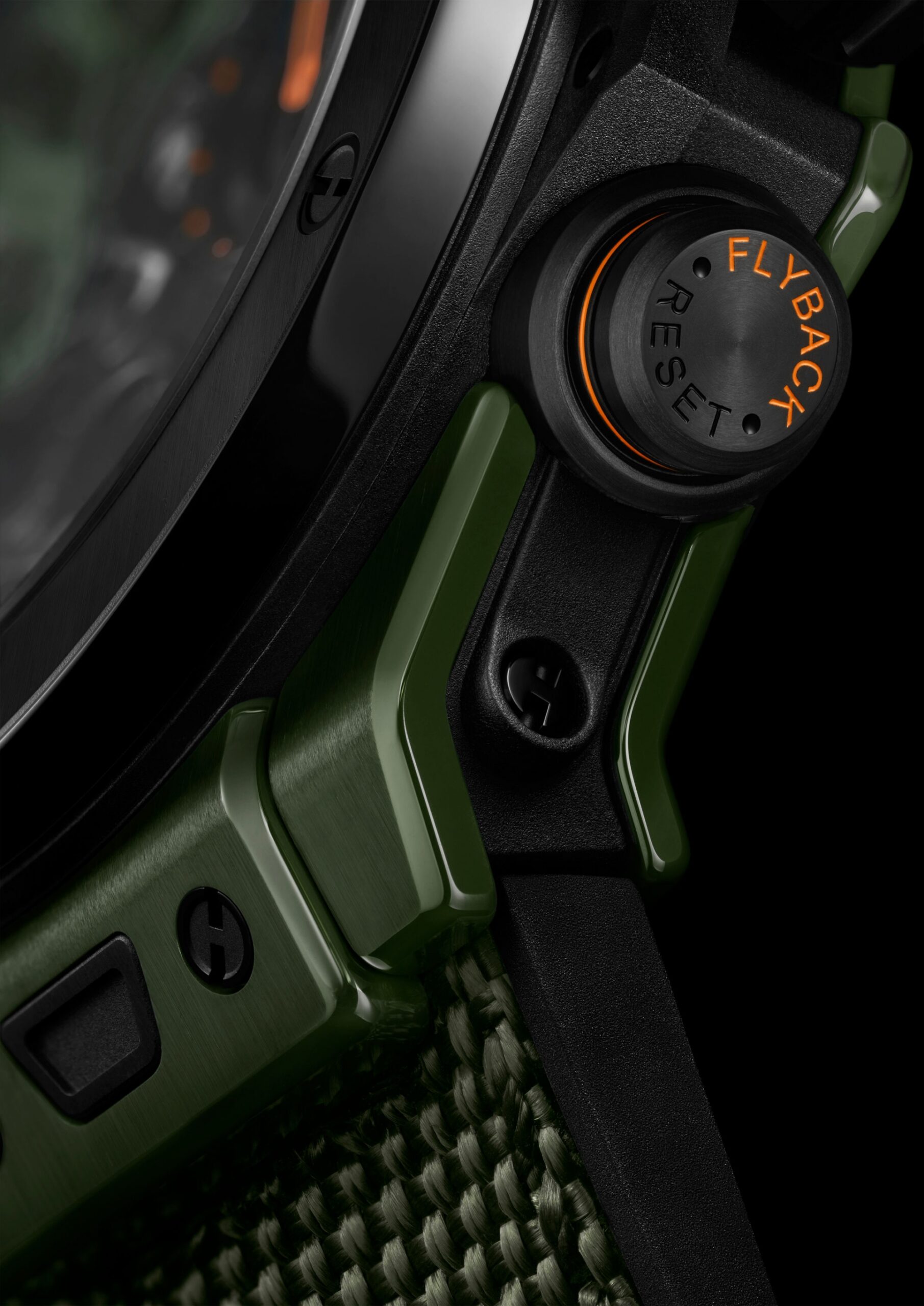 Bánh xe cột được nhấn màu tại vị trí 6 giờ và hệ thống ly hợp dao động kép tại vị trí 8 giờ ngay lập tức thu hút ánh nhìn vào bộ máy chronograph flyback in-house. Bộ đếm chronograph tại vị trí 3 giờ được thiết kế lại, lịch ngày được chuyển về giữa vị trí 4 và 5 giờ, trong khi chức năng flyback được nhấn mạnh bằng các chi tiết màu tinh tế. Kim chronograph mới thể hiện rõ tính chính xác trong từng chuyển động. Ở mặt sau, sự tương phản được thể hiện trên rotor skeleton mới với chữ H cắt rỗng, khắc dòng chữ “Hublot. Design. Manufacture. Nyon”, cùng với bánh xe cân bằng, thùng cót và hệ thống truyền động.