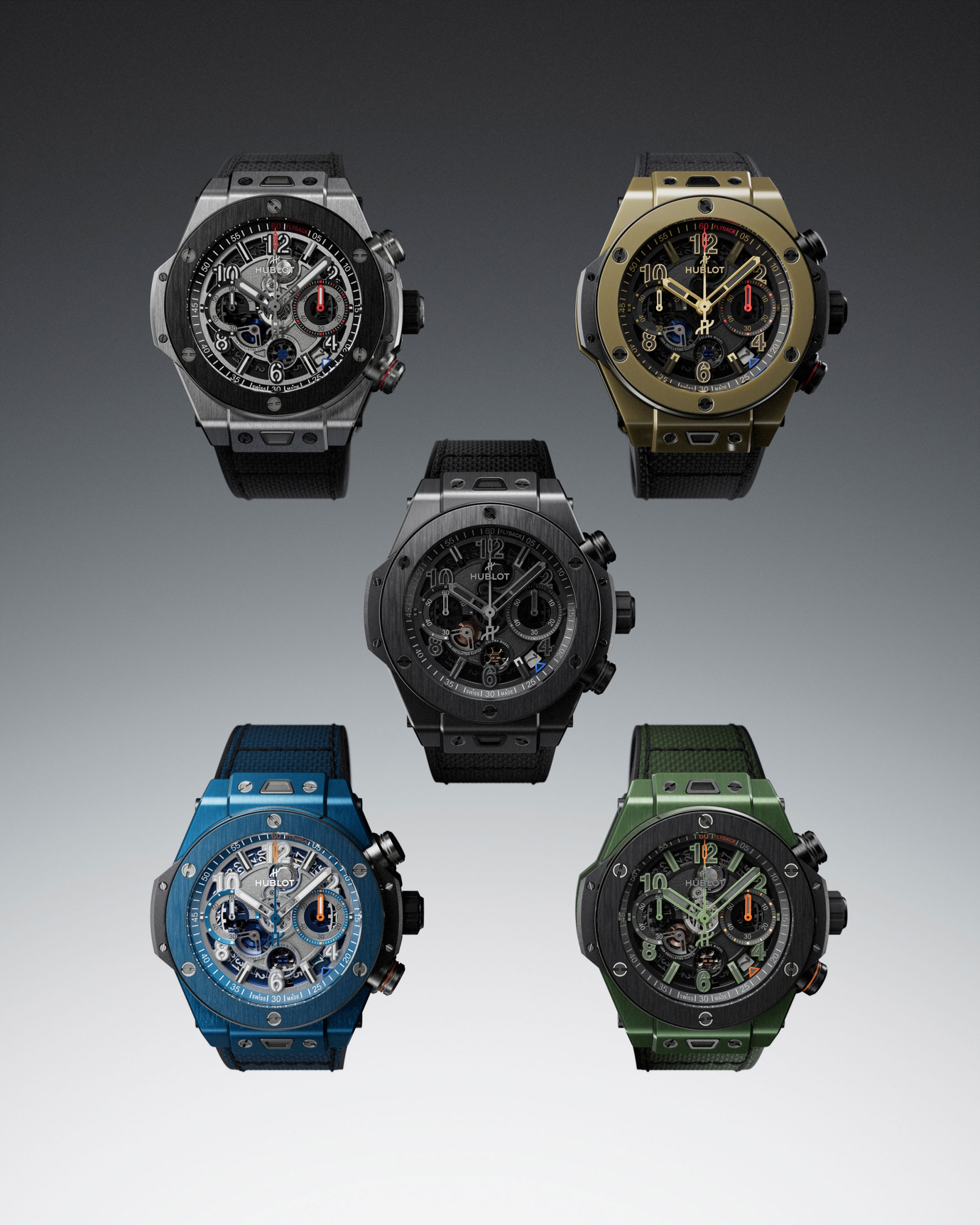 Ceramic được thể hiện qua ba phiên bản: All Black kỷ niệm 20 năm khái niệm “visibility through invisibility” mang tính cách mạng, cùng hai phiên bản xanh dương và xanh lá đậm thể hiện năng lực làm chủ ceramic công nghệ cao đa sắc của Hublot, với độ cứng cao hơn 300 Vickers so với ceramic thông thường. Phiên bản thứ năm kết hợp Titanium và Black Ceramic, hòa trộn titanium cấp hàng không siêu nhẹ với ceramic kỹ thuật nhằm đảm bảo độ bền tối đa, với bezel và vỏ titanium kết hợp nắp lưng ceramic đen – gợi nhớ đến Big Bang Unico đầu tiên ra mắt năm 2013.