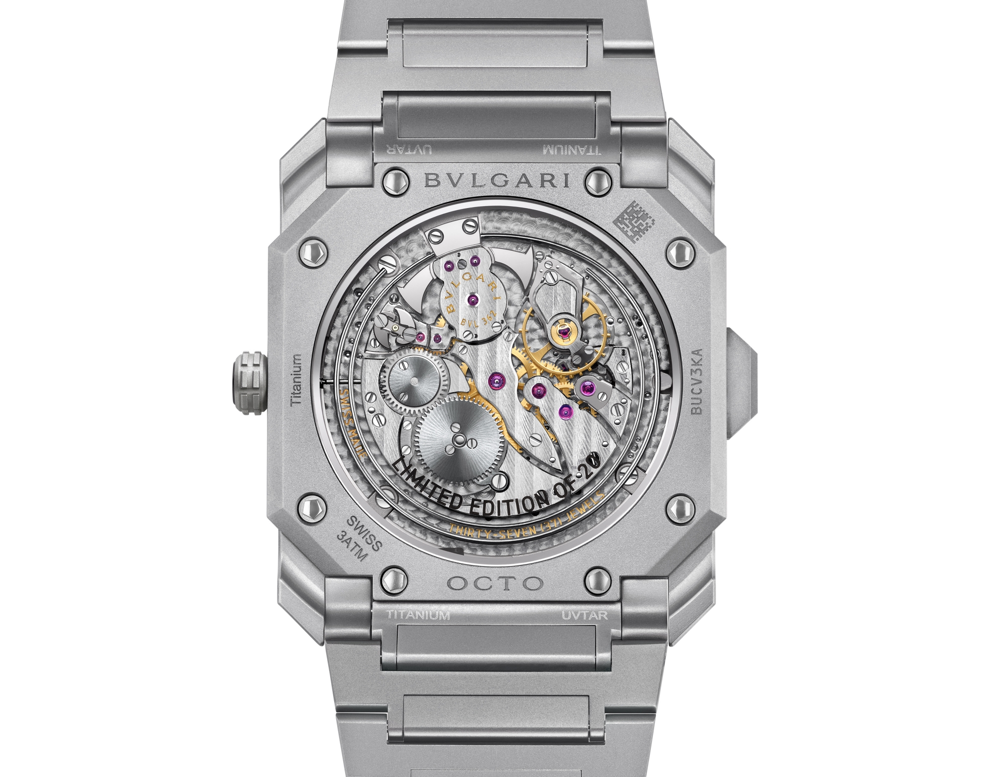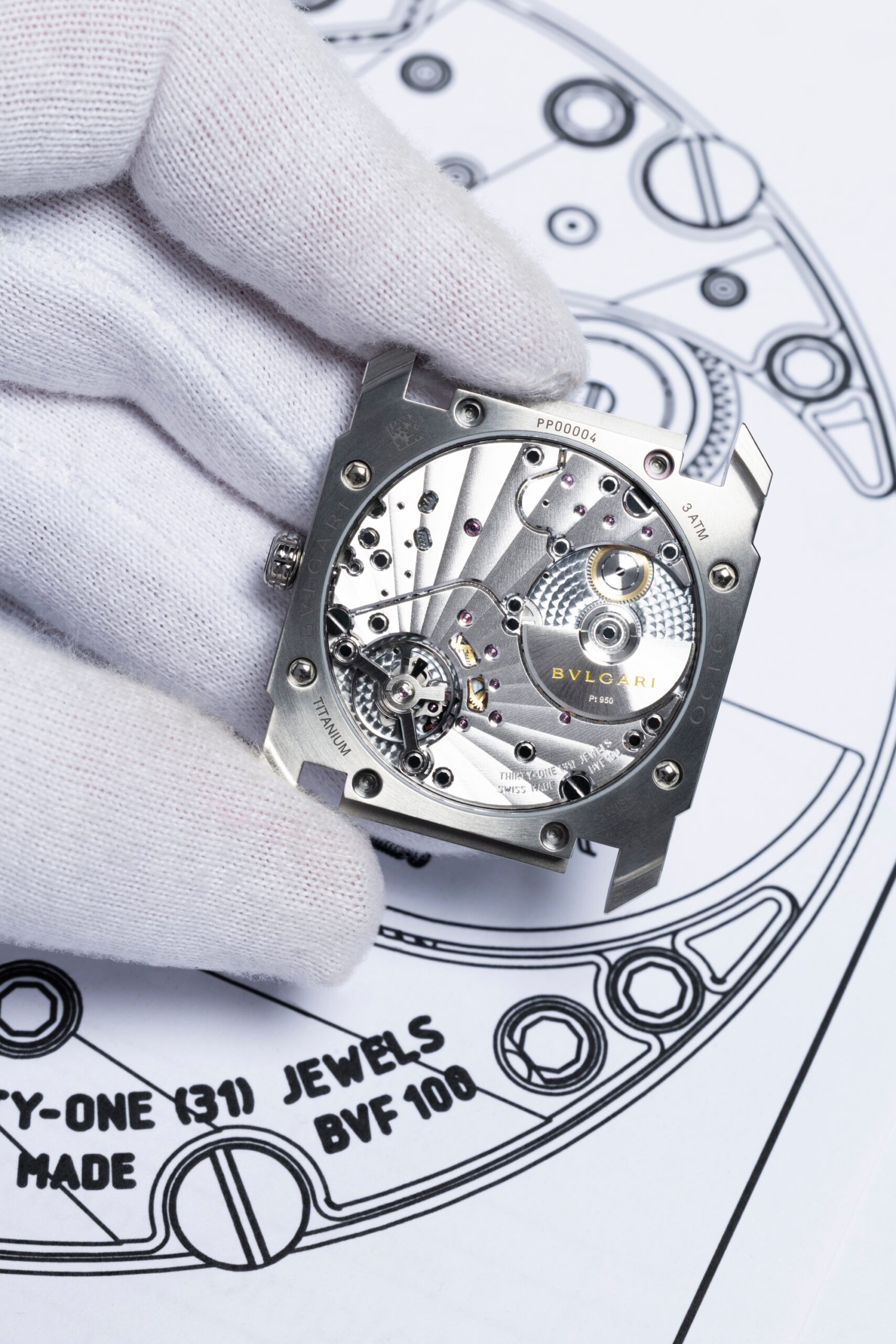 Octo Finissimo 37 được trang bị calibre BVF 100 – bộ máy automatic với micro-rotor, phát triển hoàn toàn in-house bởi Bvlgari. Với độ dày chỉ 2,35 mm và đường kính 31 mm, bộ máy này mang lại mức trữ cót 72 giờ – ba ngày vận hành liên tục.