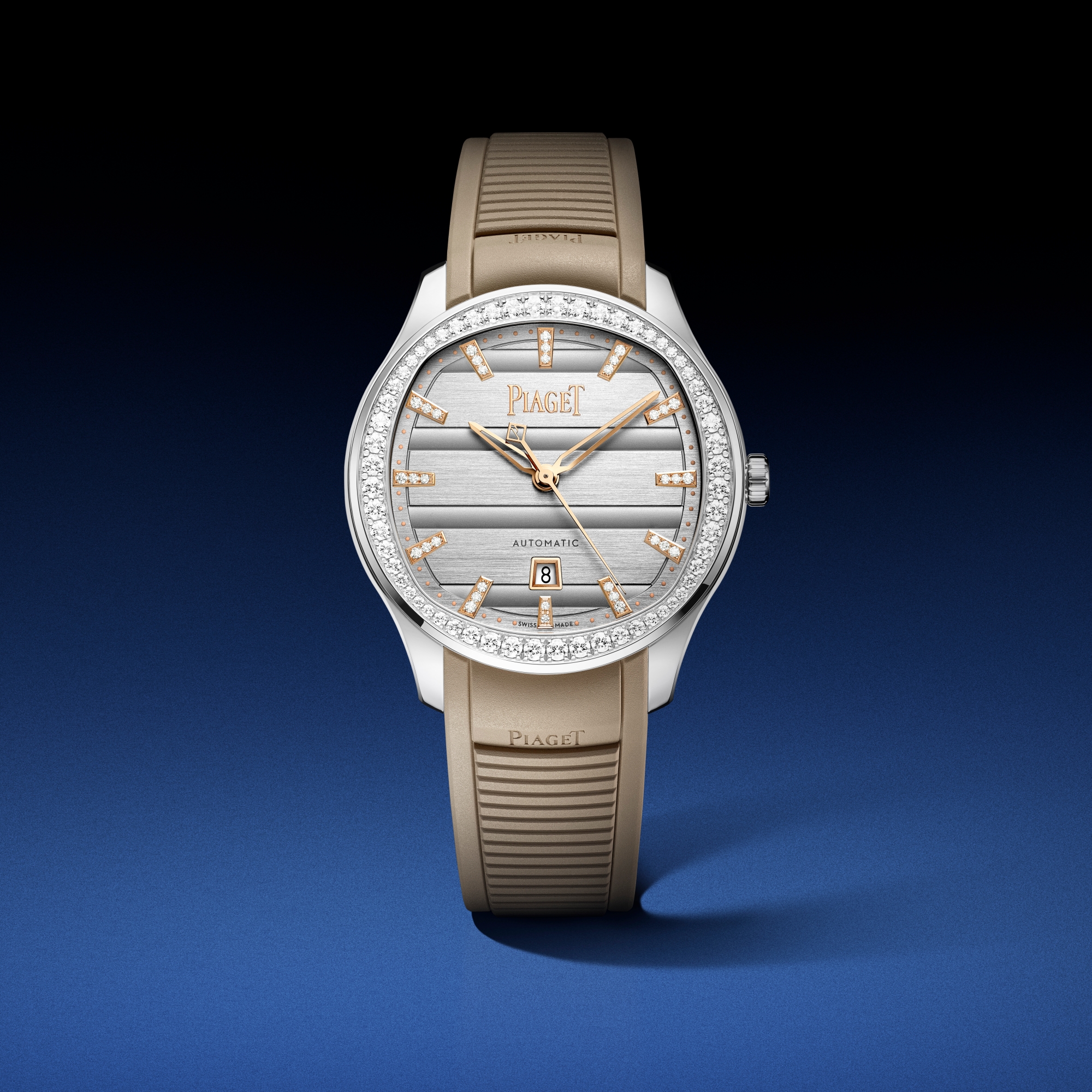 Kết hợp những dải sóng rực rỡ đã mang đến tiếng tăm cho chiếc Piaget Polo lịch sử với sức quyến rũ thể thao – thanh lịch của Piaget Polo Date, cặp đồng hồ được trang hoàng mặt số ánh bạc là cái gật đầu dành cho tinh thần thanh lịch vượt thời gian của Nhà chế tác. Dây đeo cao su hoán đổi được (có màu be cho phiên bản 36 mm trang trí 96 viên kim cương cắt giác brilliant, hoặc xanh khaki cho phiên bản 42 mm) và những dấu ấn gợi tưởng thiết kế Piaget Polo năm 1979 bồi đắp vững chắc hơn chỗ đứng của chúng trong thì hiện tại, đồng thời bám sát những mật mã phong cách đã ủ luyện bản sắc Piaget suốt hàng thập kỷ.