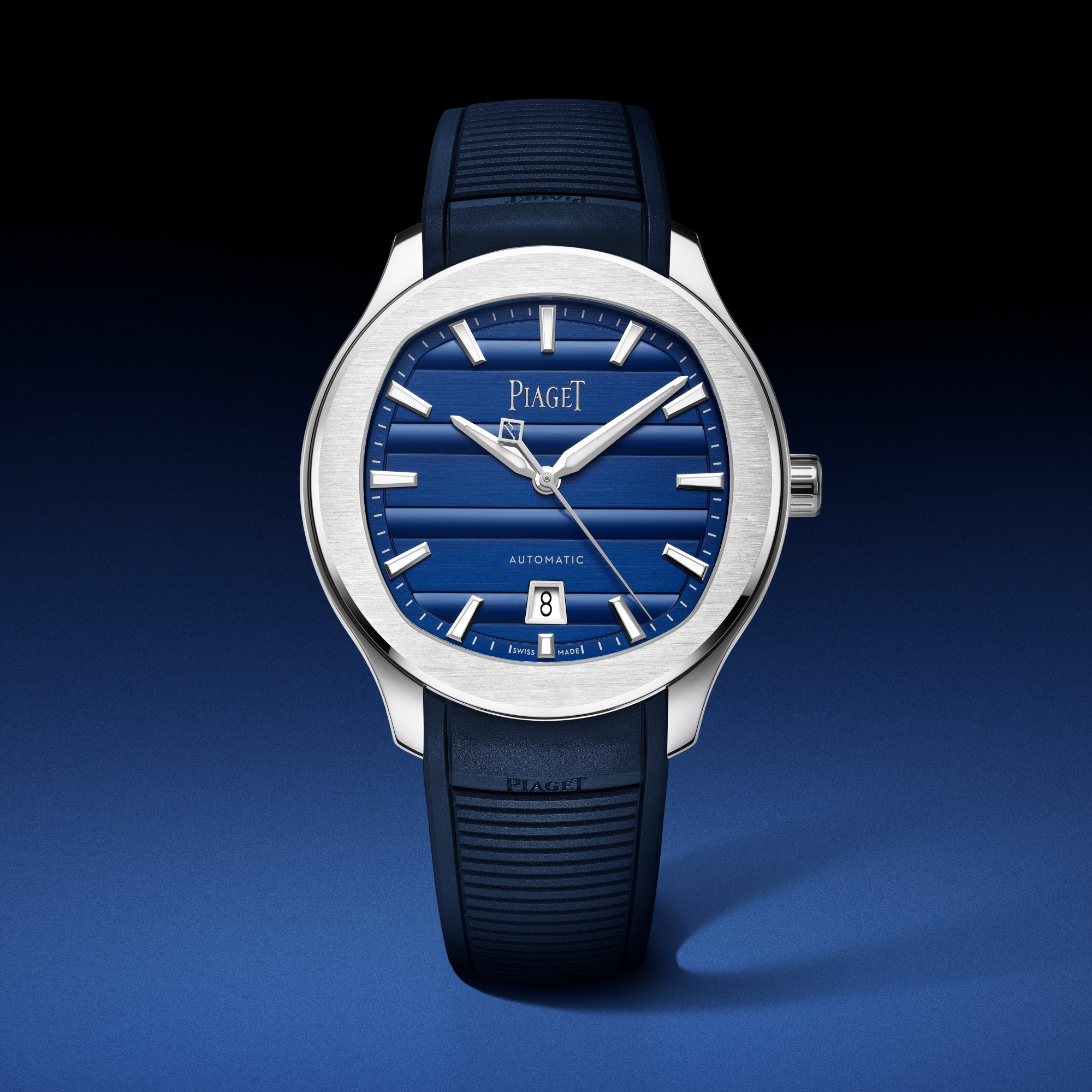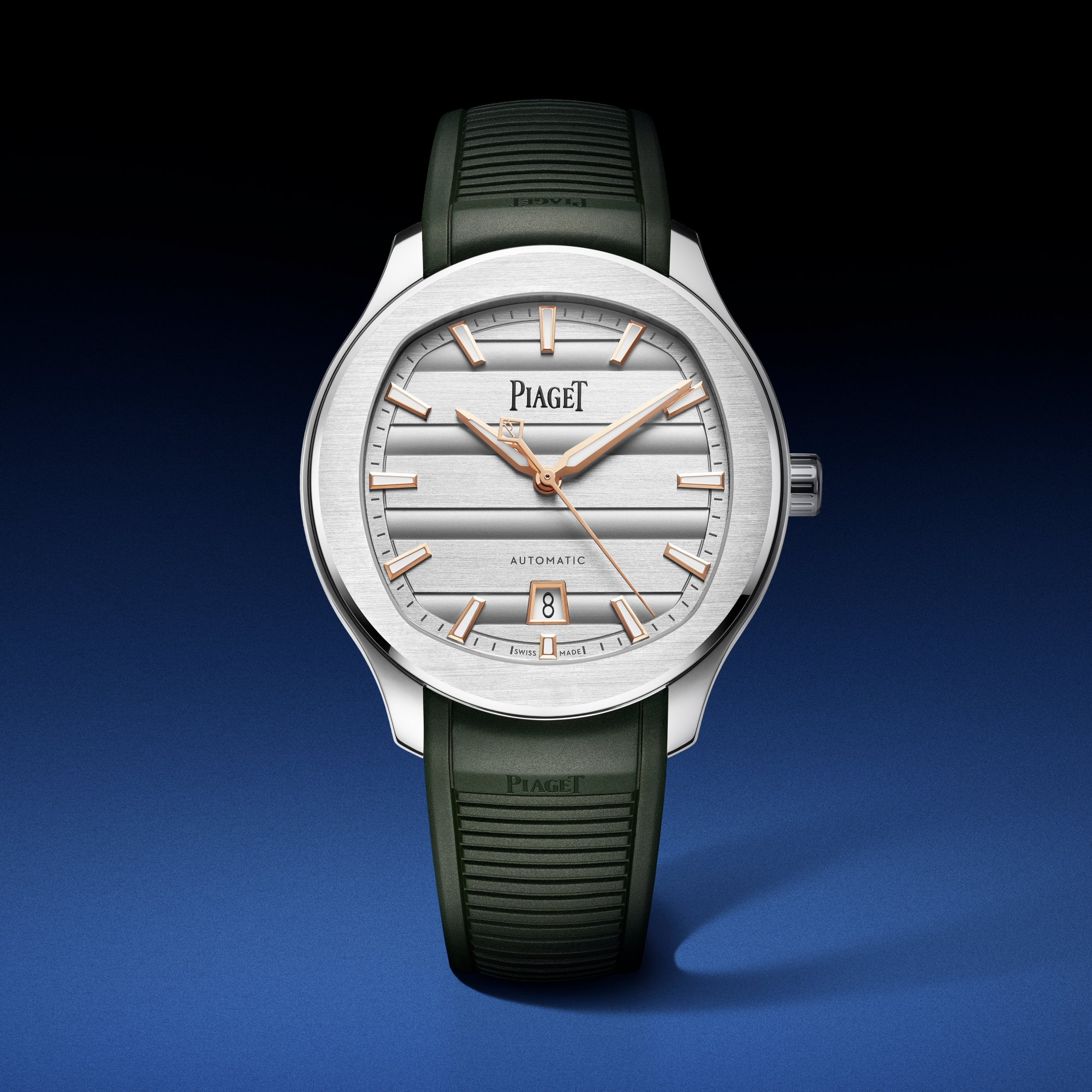 Thương hiệu cũng mang đến góc nhìn mới cho Piaget Polo Signature Date. Sự đan xen giữa những đường nét hình học dẫn dụ đến từ dải sóng đặc trưng của Piaget Polo 79 giờ đây cũng xuất hiện trên toàn bộ dải mặt số Piaget Polo xanh dương, cộng thêm hai phiên bản vàng mới cỡ vỏ 42 mm (thép hoặc vàng hồng, dây đeo cao su hoặc thép hoán đổi được, và mặt số đính đá quý hoặc không), cũng như ba phiên bản 36 mm: vỏ thép với cọc giờ đính đá quý, viền và cọc giờ đính đá quý, và phiên bản vàng hồng với viền và cọc giờ kim cương đắt giá.