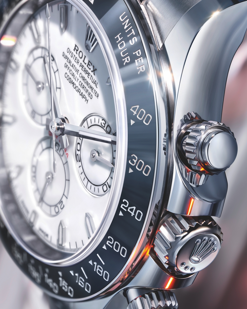 Trên thang đo tachymetric của vành đồng hồ mới này, các chữ số được bố trí theo chiều ngang, gợi nhớ đến thiết kế của mẫu Cosmograph Daytona đầu tiên. Những chữ số ‘treo lơ lửng’ này được khắc theo phông chữ vô cùng hiện đại. Bộ máy đồng hồ lộ ra qua nắp lưng bằng kính sapphire, được cố định bằng một vòng bạch kim.