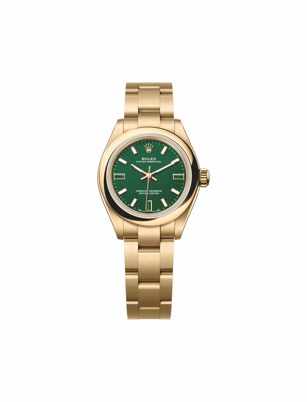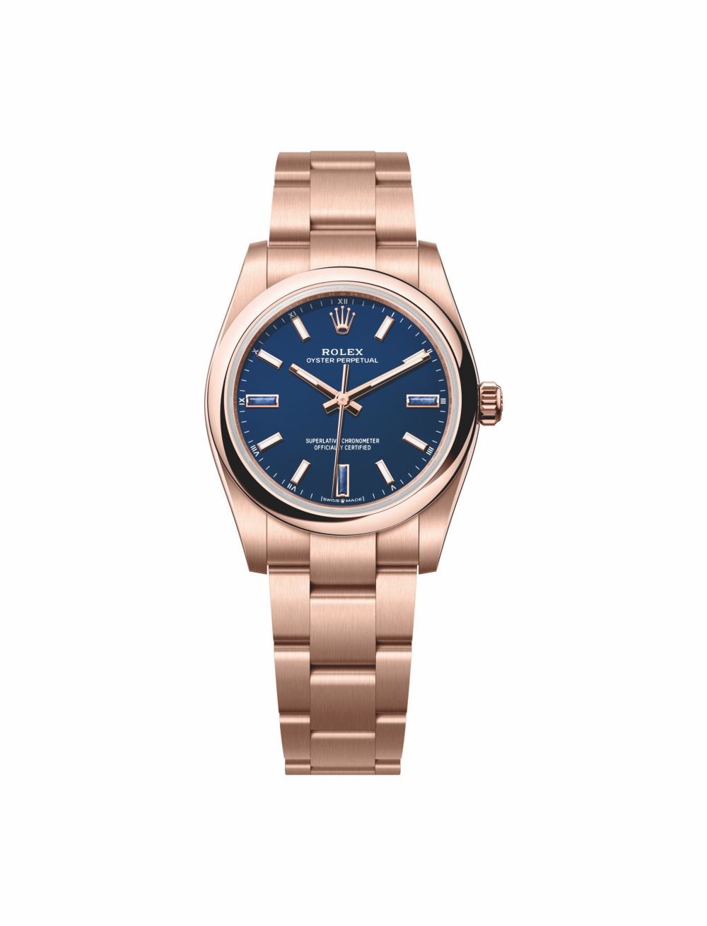 Oyster Perpetual 28 được chế tác từ vàng kim 18 ct và có mặt số sơn mài màu green stone, trong khi Oyster Perpetual 34 được chế tác từ vàng Everose 18 ct với mặt số sơn mài màu blue stone. Các vạch dấu giờ ở vị trí 3, 6 và 9 giờ được chế tác từ đá tự nhiên, đây là lần đầu tiên Rolex sử dụng vật liệu này.