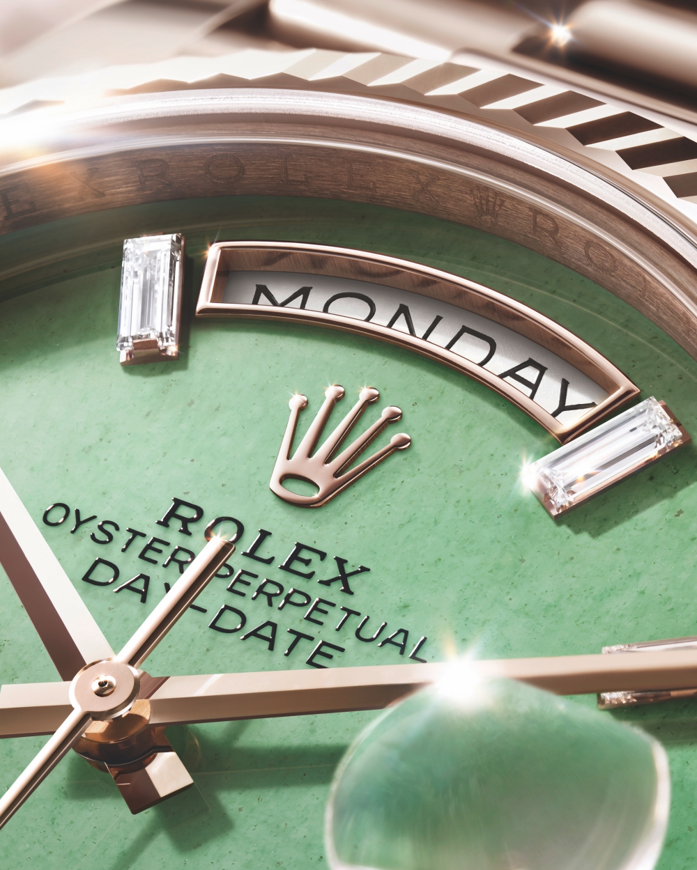 Day-Date 40 bằng vàng Jubilee 18 ct với mặt số bằng đá aventurine màu xanh lục nhạt. Tỏa sáng dịu nhẹ. Không chỉ là màu sắc mà còn là hiệu ứng. Oyster Perpetual Day-Date 40 ra mắt với chất liệu vàng Jubilee 18 ct. Với những sắc thái vàng dịu, xám ấm và hồng mềm mại, hợp kim hoàn toàn mới này, được phát triển và sản xuất nội bộ, minh họa khả năng đổi mới và sự tinh thông kỹ thuật của Rolex trong lĩnh vực kim loại quý.